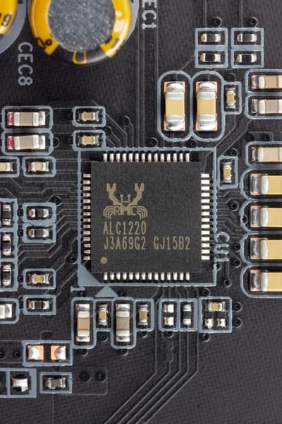 Как и практически во всех современных материнских платах, звуком заведует аудиокодек Realtek ALC1220 (в данном случае — улучшенный вариант ALC1220-VB). Он обеспечивает вывод звука по схемам до 7.1.