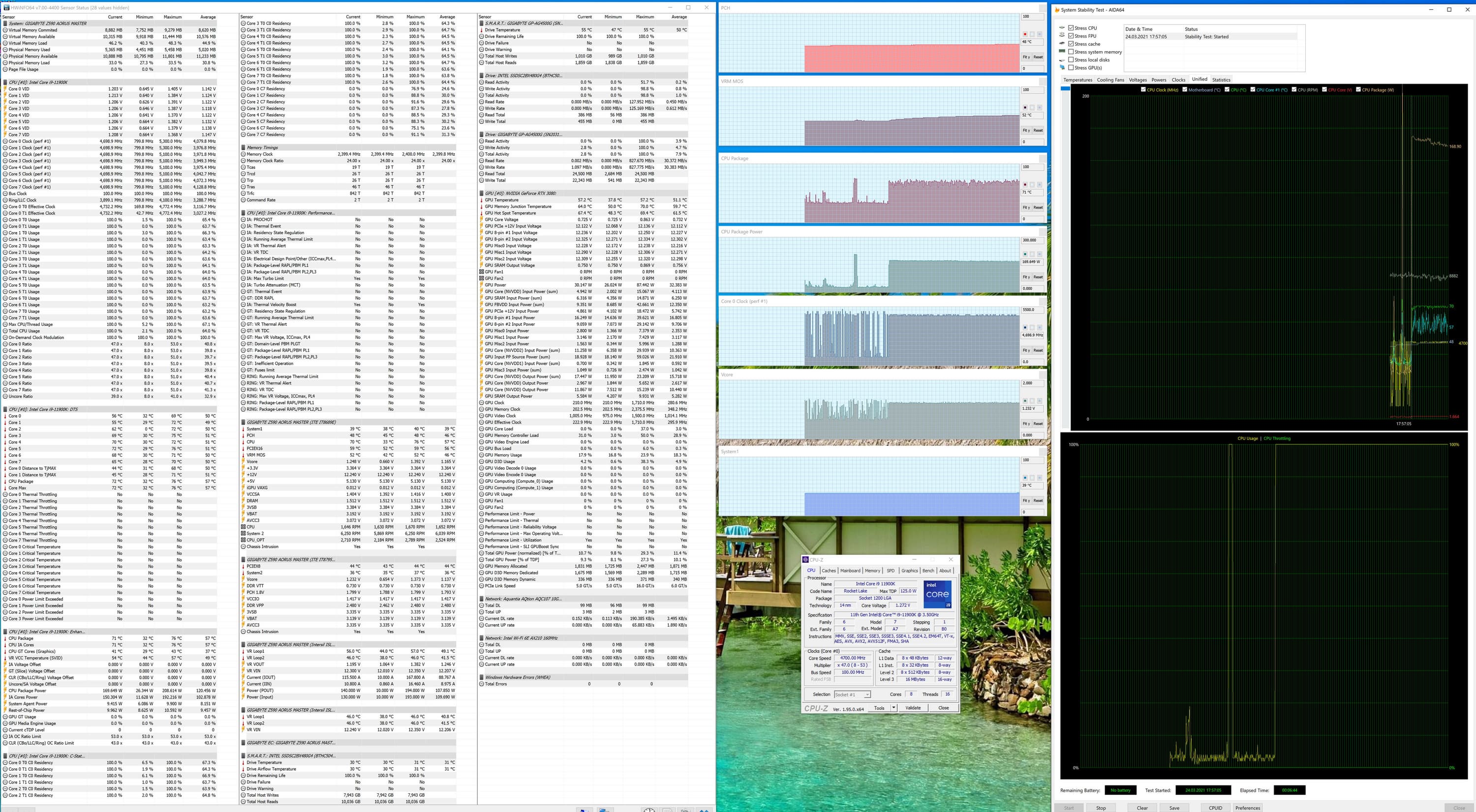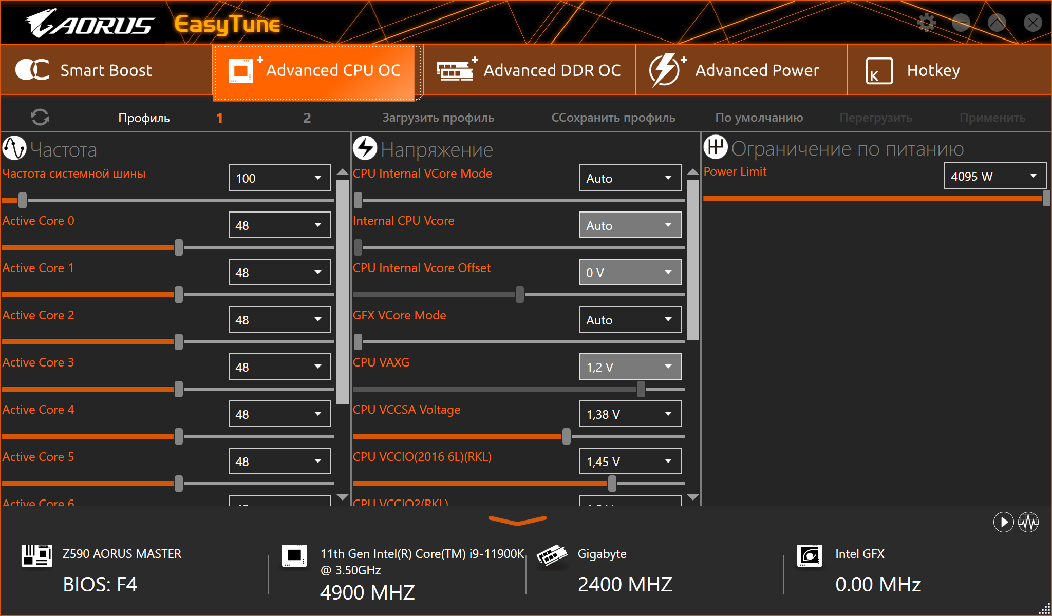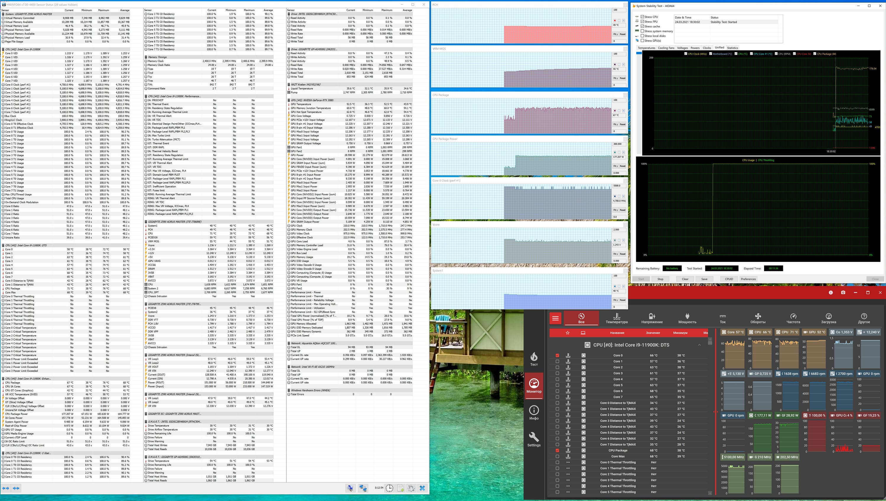 Вот, уже наблюдаем картину, когда высокие частоты (как и потребление) держатся долго, перегрева нет (вольтаж на ядре не выше 1,27 В), СВО надежно справляется с работой. Конечно же нам интересно получить и 5,3 ГГц, ведь обещано, что 11е поколение должно справляться с такими частотами. Однако пока еще сырость BIOS не позволила получить обещанное, ибо при любой попытке выставления вручную частот выше 5,1 ГГц система поднимала вольтаж на ядре выше 1,5 В, и моментально случался перегрев при нагрузке. Конечно же, это судьба многих тестов перед релизом, когда обновления BIOS приходят чуть ли не каждый день, и невозможно угадать, когда придет финальная стабильная версия.