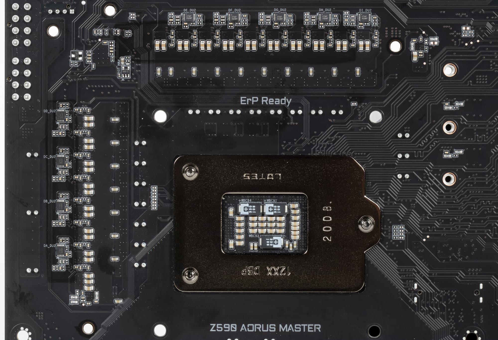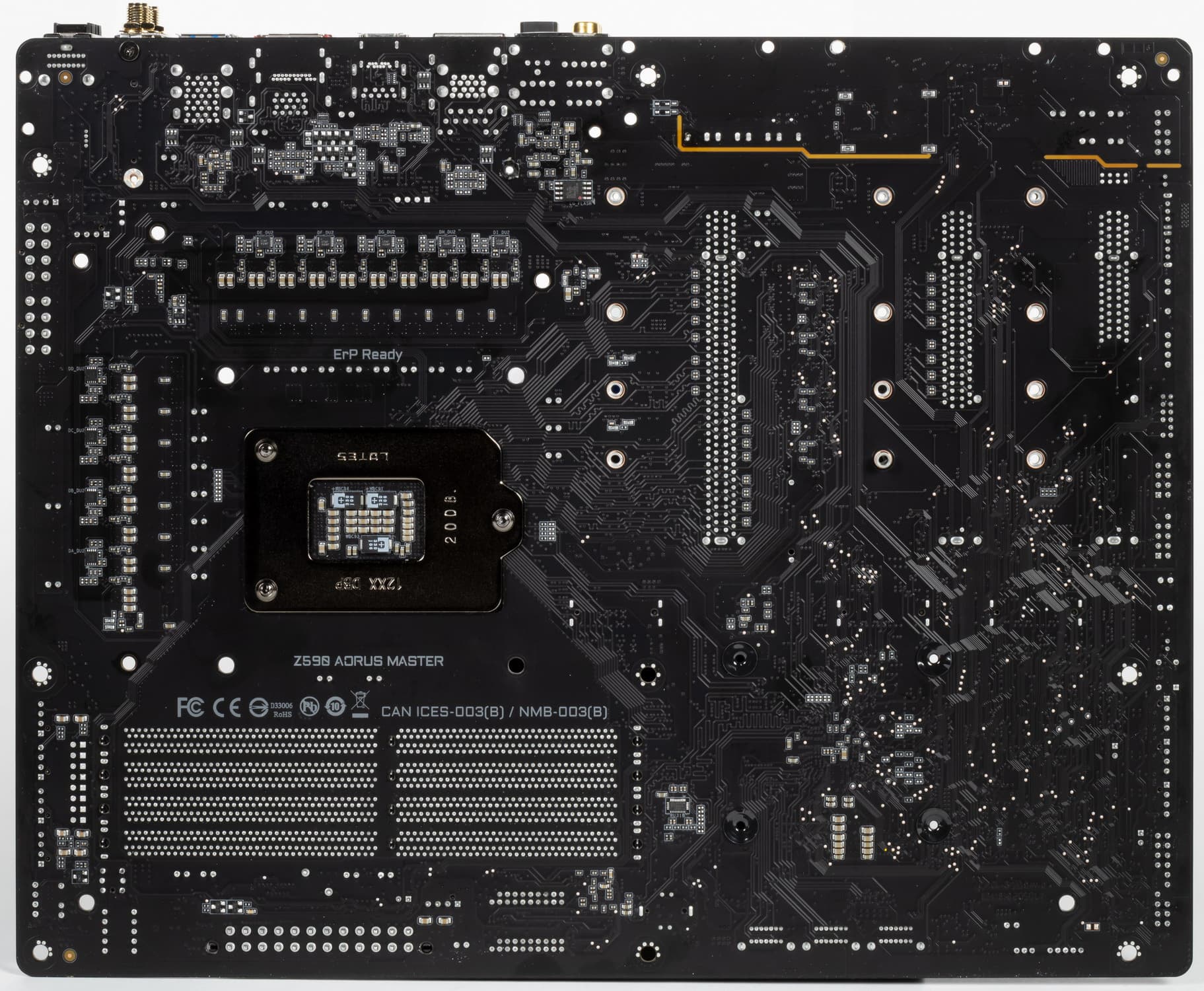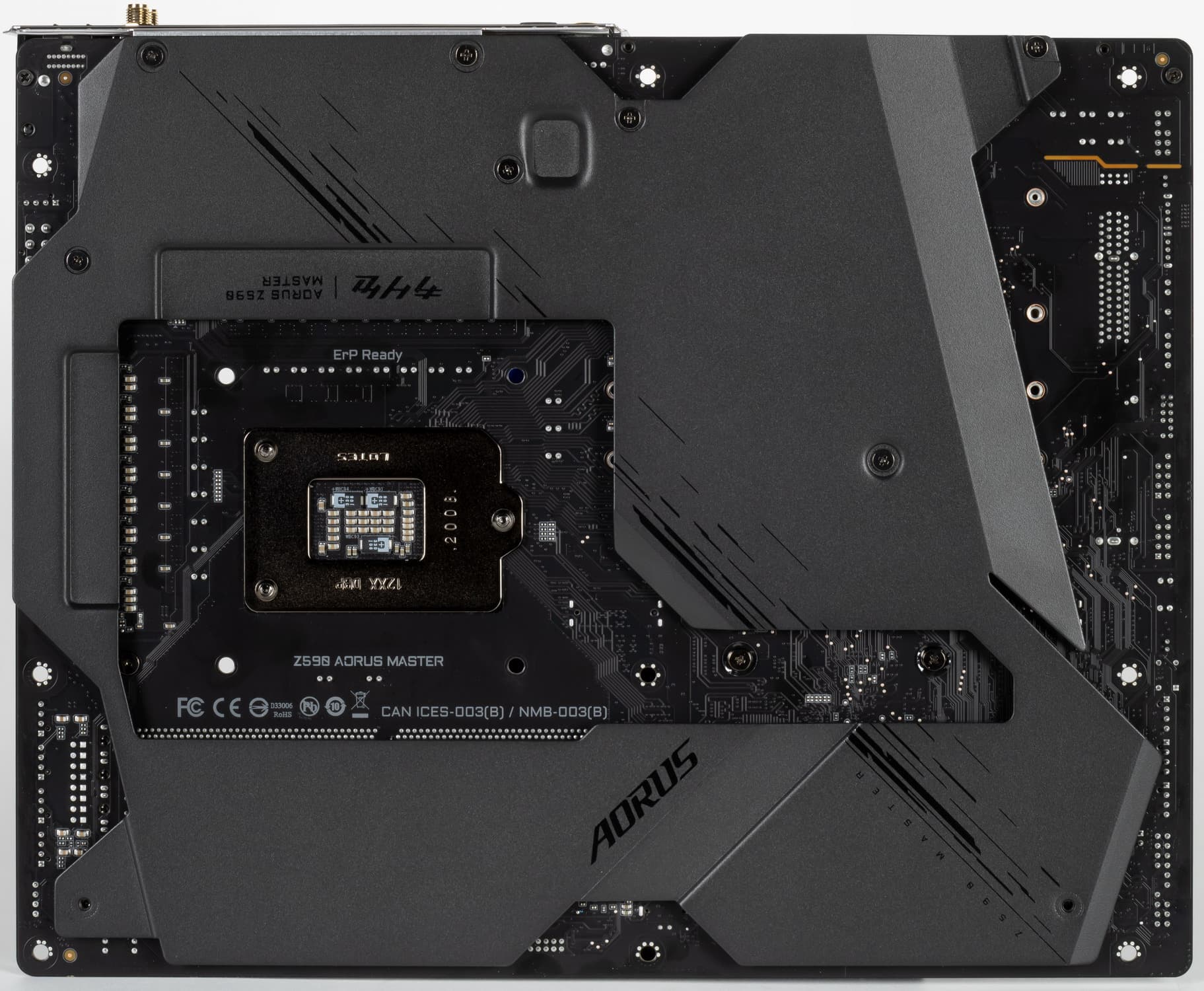Оборотная сторона — не пустая, там расположены некоторые контроллеры, имеются удвоители фаз питания и прочее. А вот обработан текстолит очень хорошо: во всех точках пайки не только острые концы срезаны, но и все гладко отшлифовано. С той же стороны установлена пластина из алюминия с наноуглеродным покрытием. Также пластина помогает отводить тепло от задней стороны PCB через термоинтерфейс и обеспечивает жесткость материнской платы.