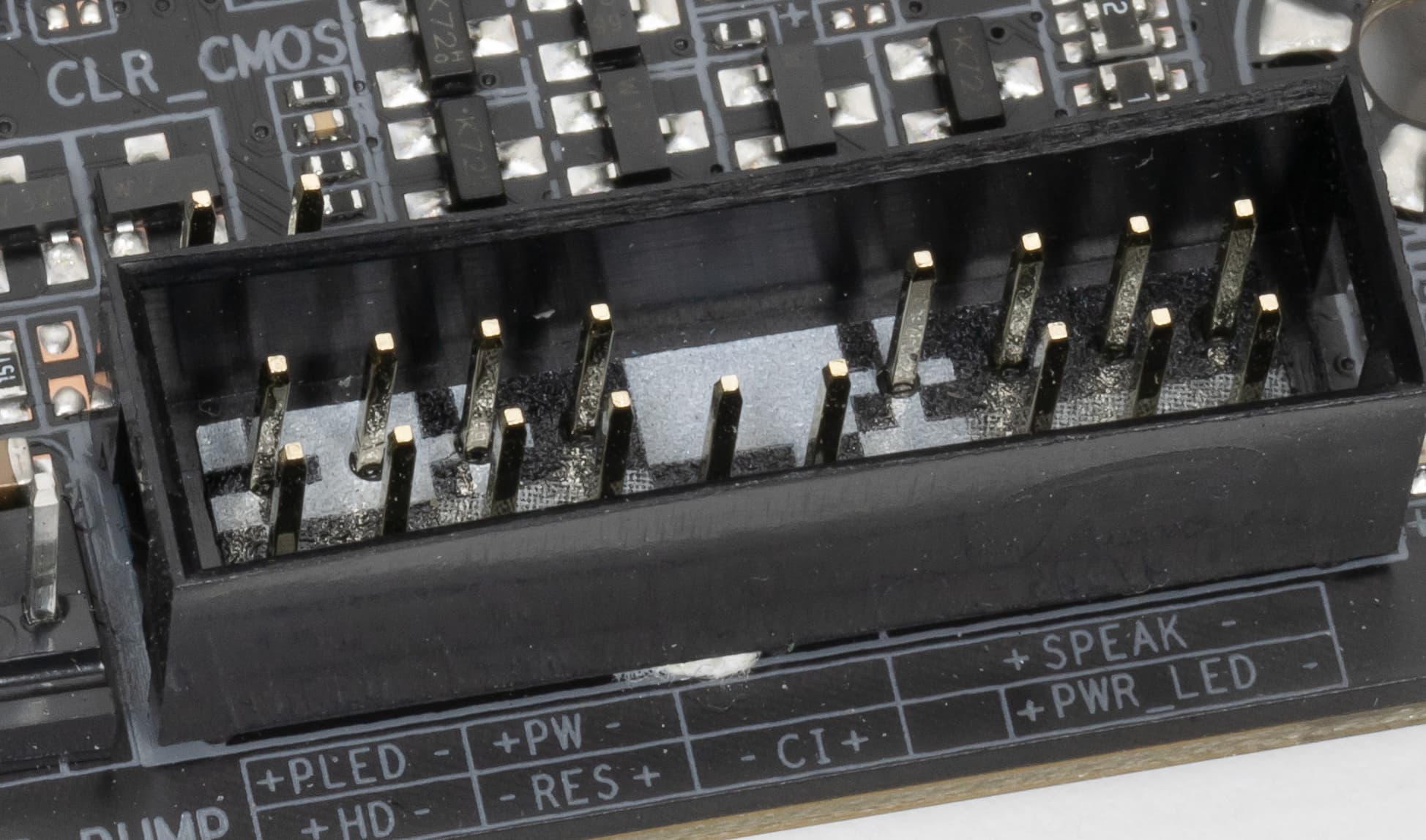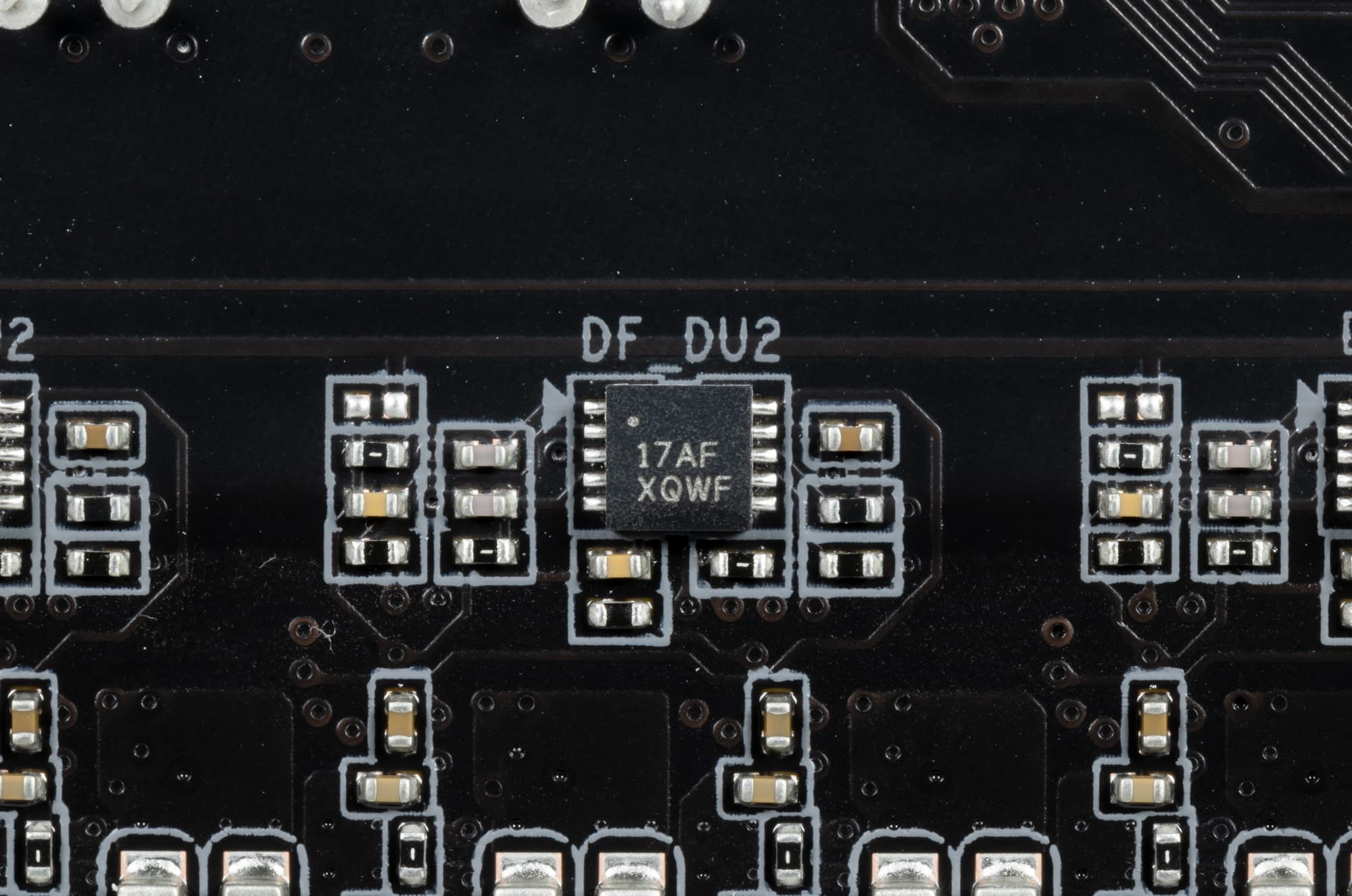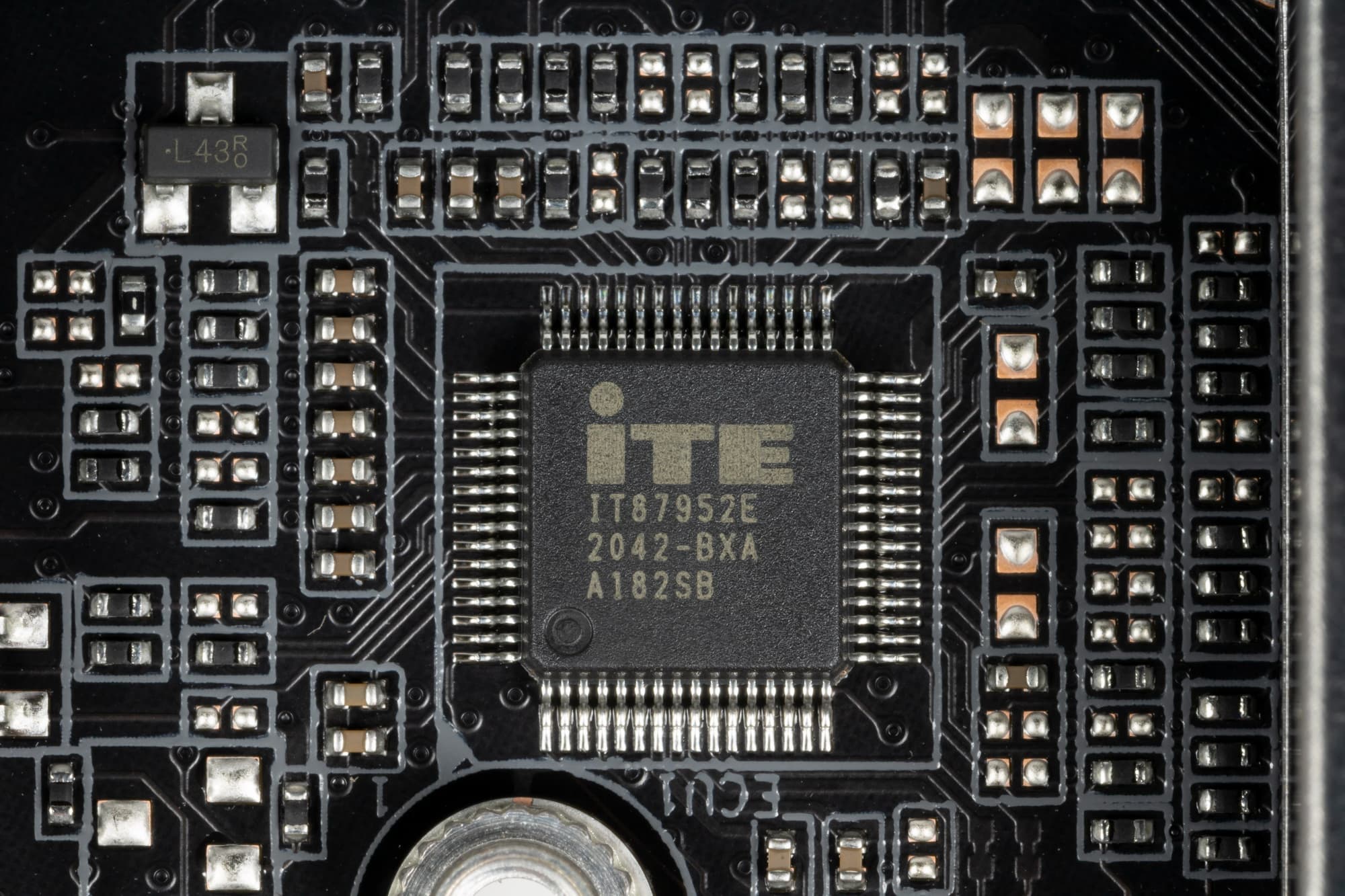 Оборотная сторона — не пустая, там расположены некоторые контроллеры, имеются удвоители фаз питания и прочее. А вот обработан текстолит очень хорошо: во всех точках пайки не только острые концы срезаны, но и все гладко отшлифовано. С той же стороны установлена пластина из алюминия с наноуглеродным покрытием. Также пластина помогает отводить тепло от задней стороны PCB через термоинтерфейс и обеспечивает жесткость материнской платы.