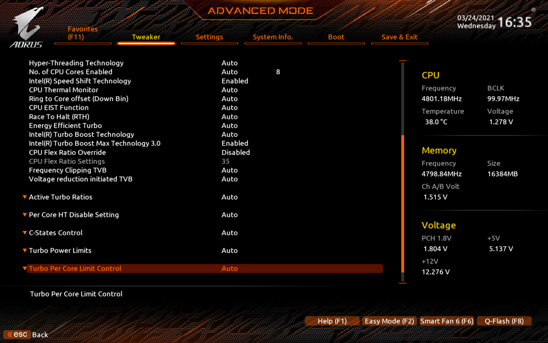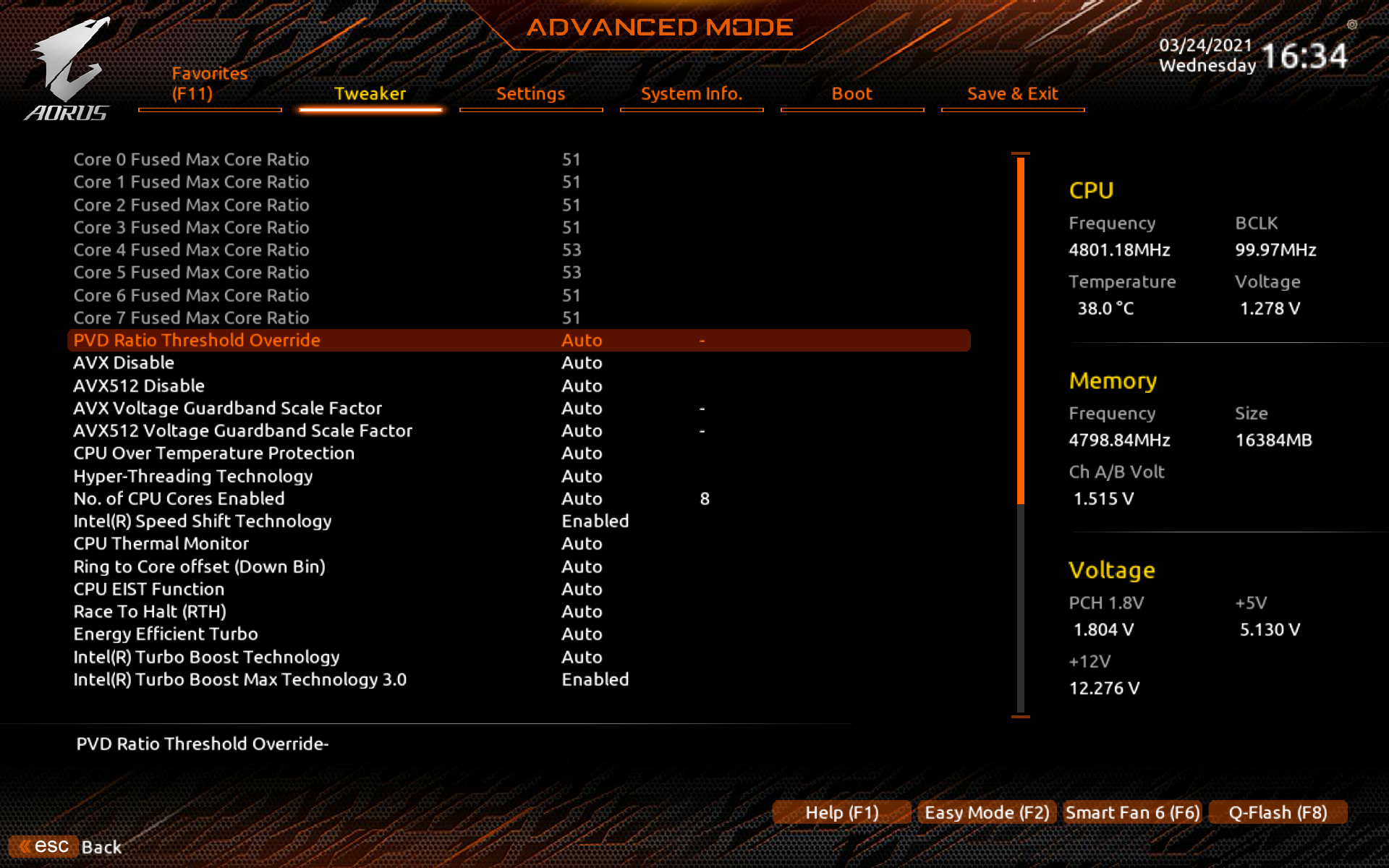 Здесь мы видим картину относительно умеренного авторазгона процессора от 4,7 до 5,1 ГГц по всем ядрам. Что уже неплохо, согласитесь, по сравнению с базовой частотой 3,5 ГГц. При этом стоит напомнить, что если мы все запускаем в авторежиме, то лимит потребления PL2 не даст получить крайне высокие частоты в течение долгого времени, по медленному сбросу потребления можно понять, что эти лимиты были включены. Остальные параметры работы системы по нагреву были в норме (вольтаж на ядре CPU около 1.2 В).