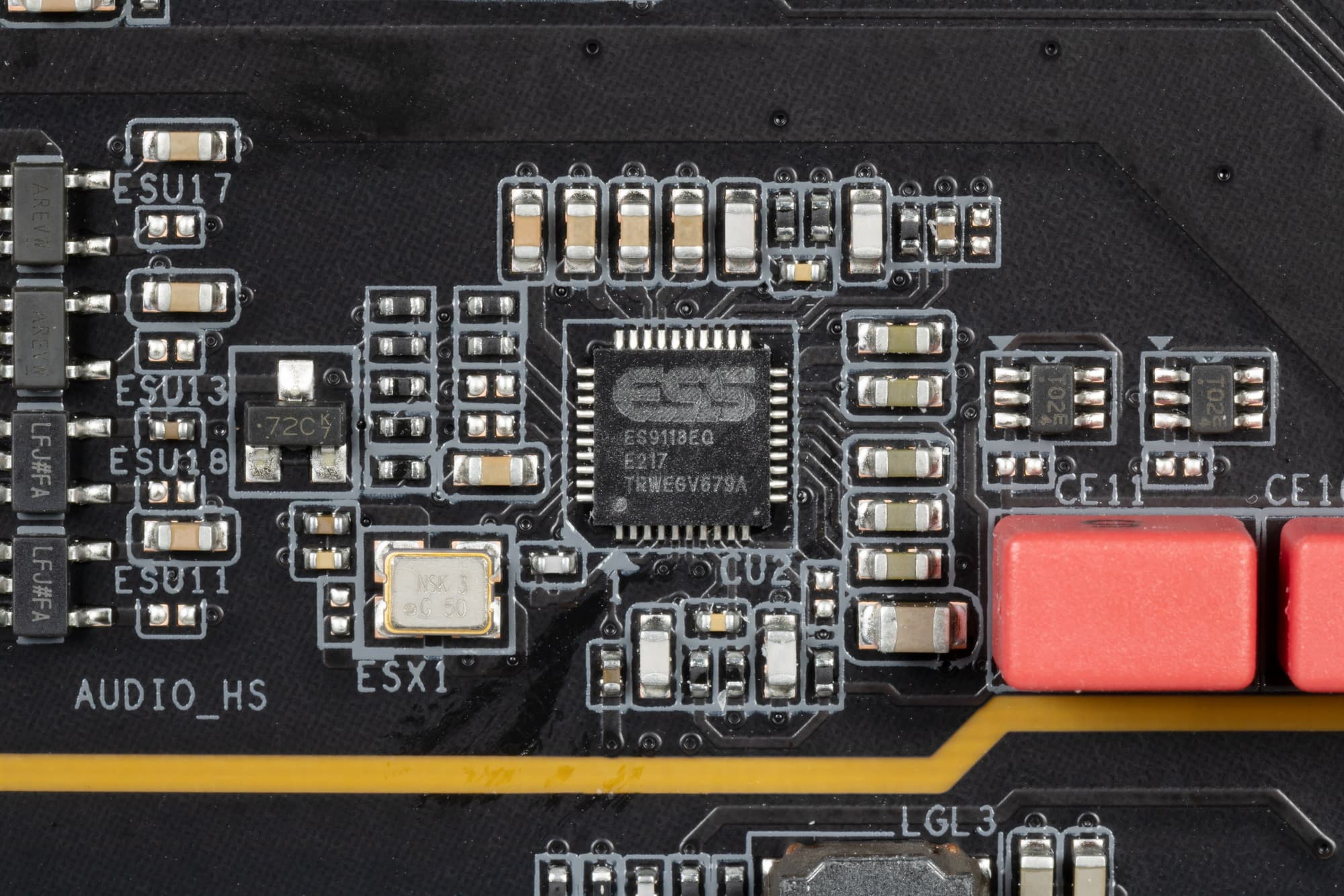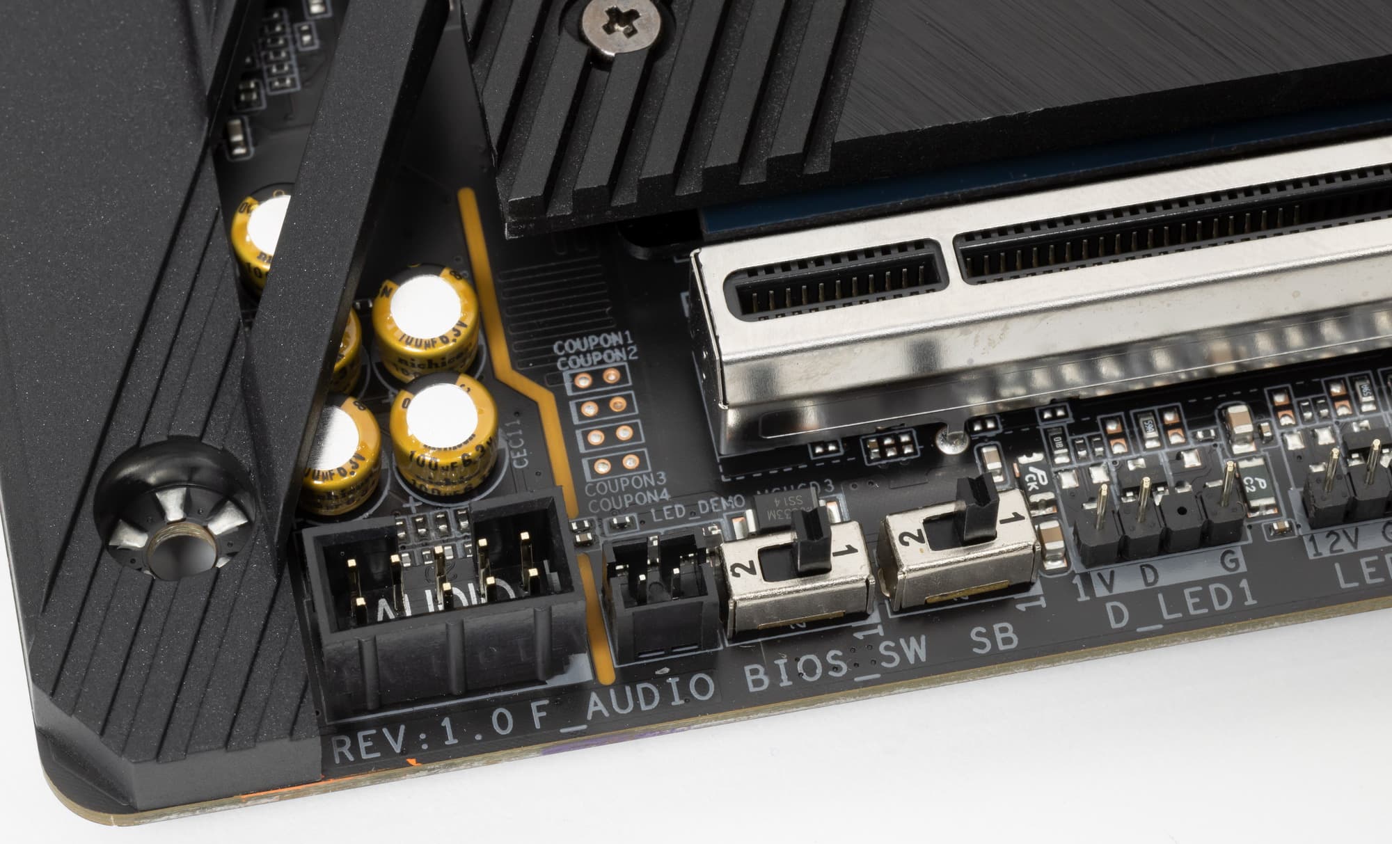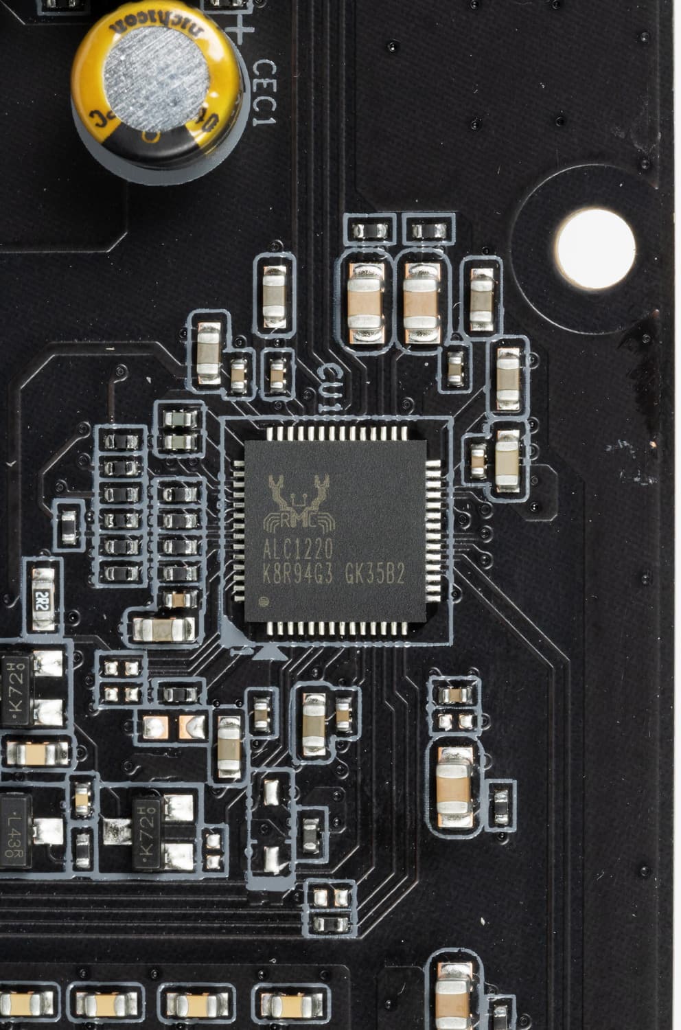 Аудиотракт вынесен на угловую часть платы, не пересекается с другими элементами. Все аудиоразъемы на задней панели имеют позолоченное покрытие, однако нет привычной цветовой окраску разъемов, поэтому ориентироваться можно только по обозначениям.