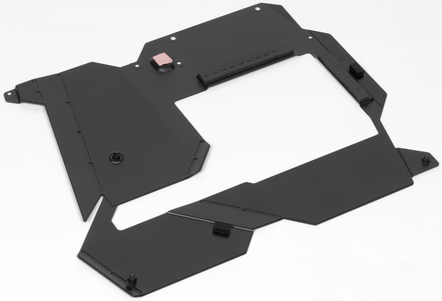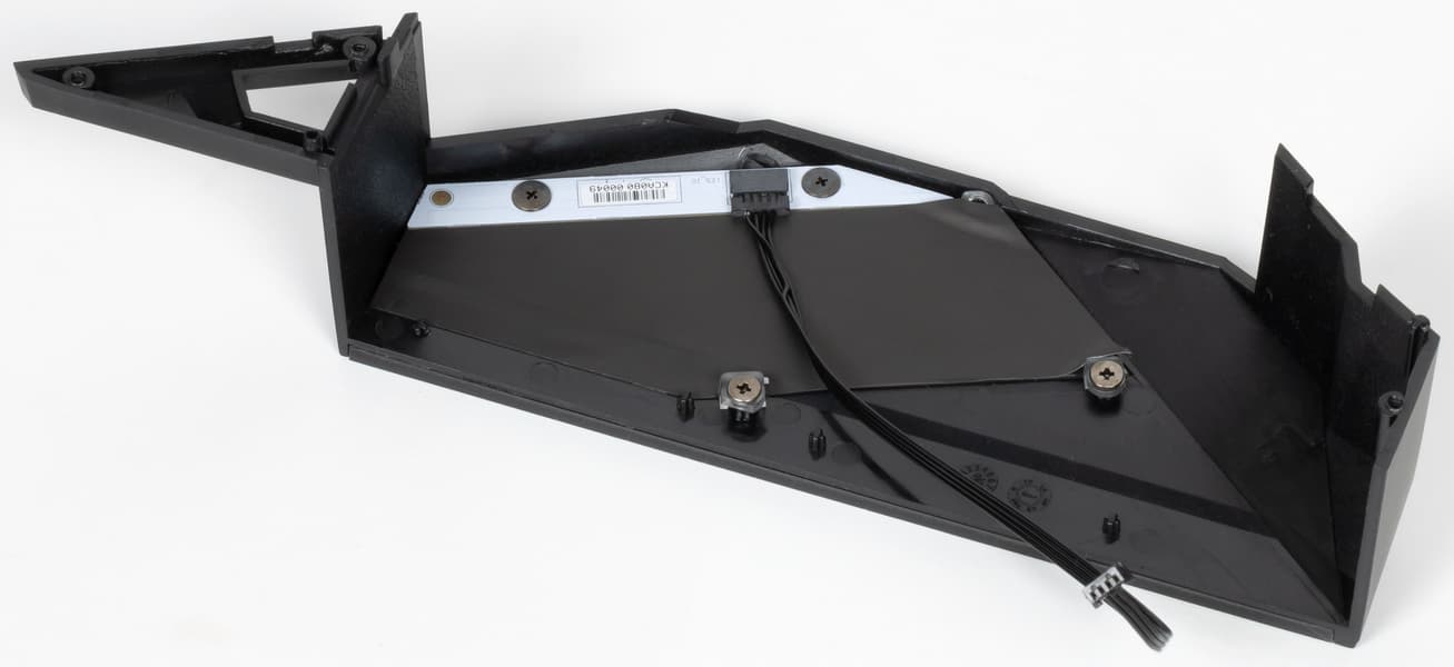 Над аудиоподсистемой и задним блоком портов установлен пластиковый кожух соответствующего дизайна, он оснащен подсветкой.