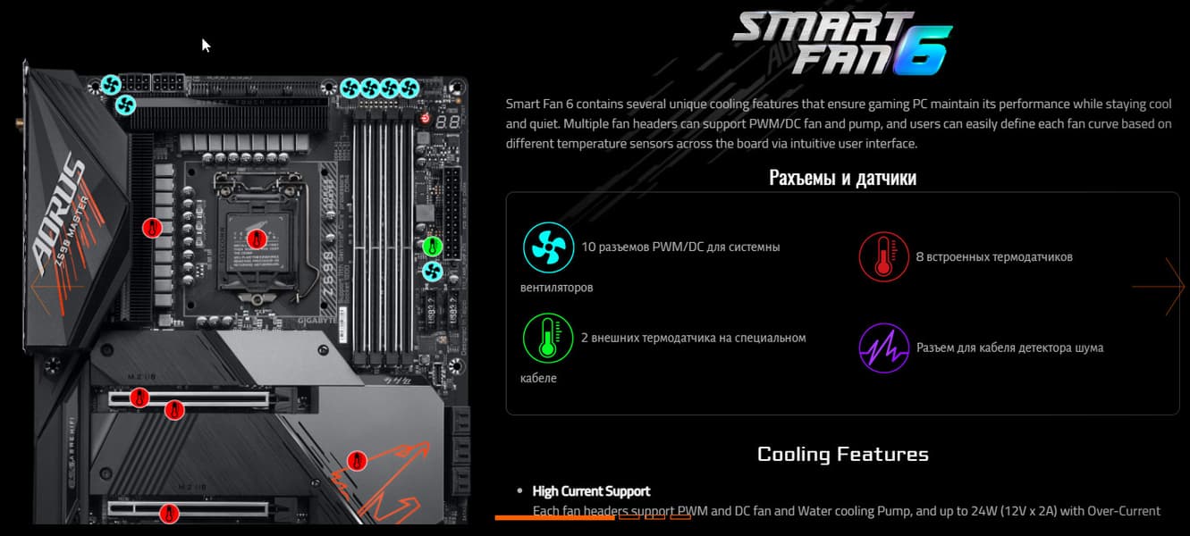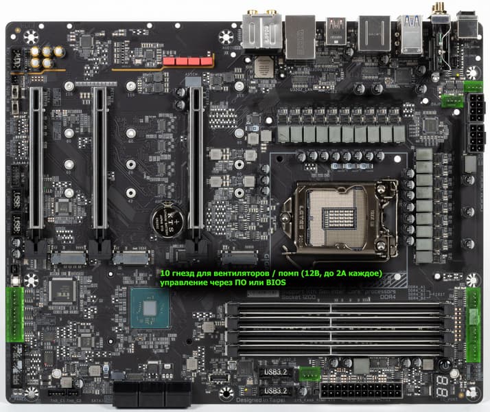 Теперь про блок ввода-вывода, разъемы для подключения вентиляторов и т. п. Разъемов для подключения вентиляторов и помп на самой плате — 10. Схема размещения коннекторов для систем охлаждения выглядит так:
