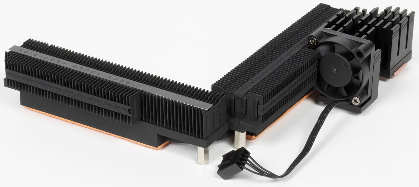 Как мы видим, охлаждение чипсета (один радиатор) организовано отдельно от силовых преобразователей. VRM-секция имеет свои два радиатора, соединенные тепловой трубкой под прямым углом.
