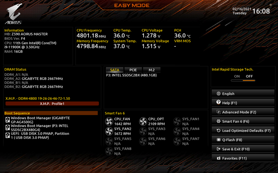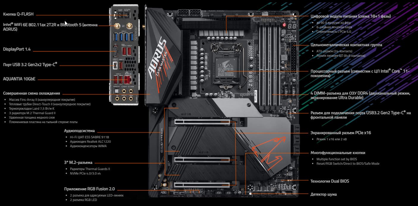 Как и положено флагманам, Gigabyte Z590 Aorus Master предлагает дополнительные возможности для любителей разгона (например, датчики напряжений и температур), много настроек в BIOS Setup и фирменных утилитах и вполне готова обеспечить любой разгон — лишь бы кулер справлялся. Платы совершенно нового семейства Z590 поддерживают процессоры Intel Core 11-го поколения с повышенной производительностью на ядро/поток. Кроме того, они обеспечивают интерфейс PCIe 4.0 как для слотов M.2, так и для традиционных слотов PCIe x16 (впрочем, это актуально разве что для видеокарт AMD Radeon RX 5500 XT, где интерфейс урезан с х16 до х8).