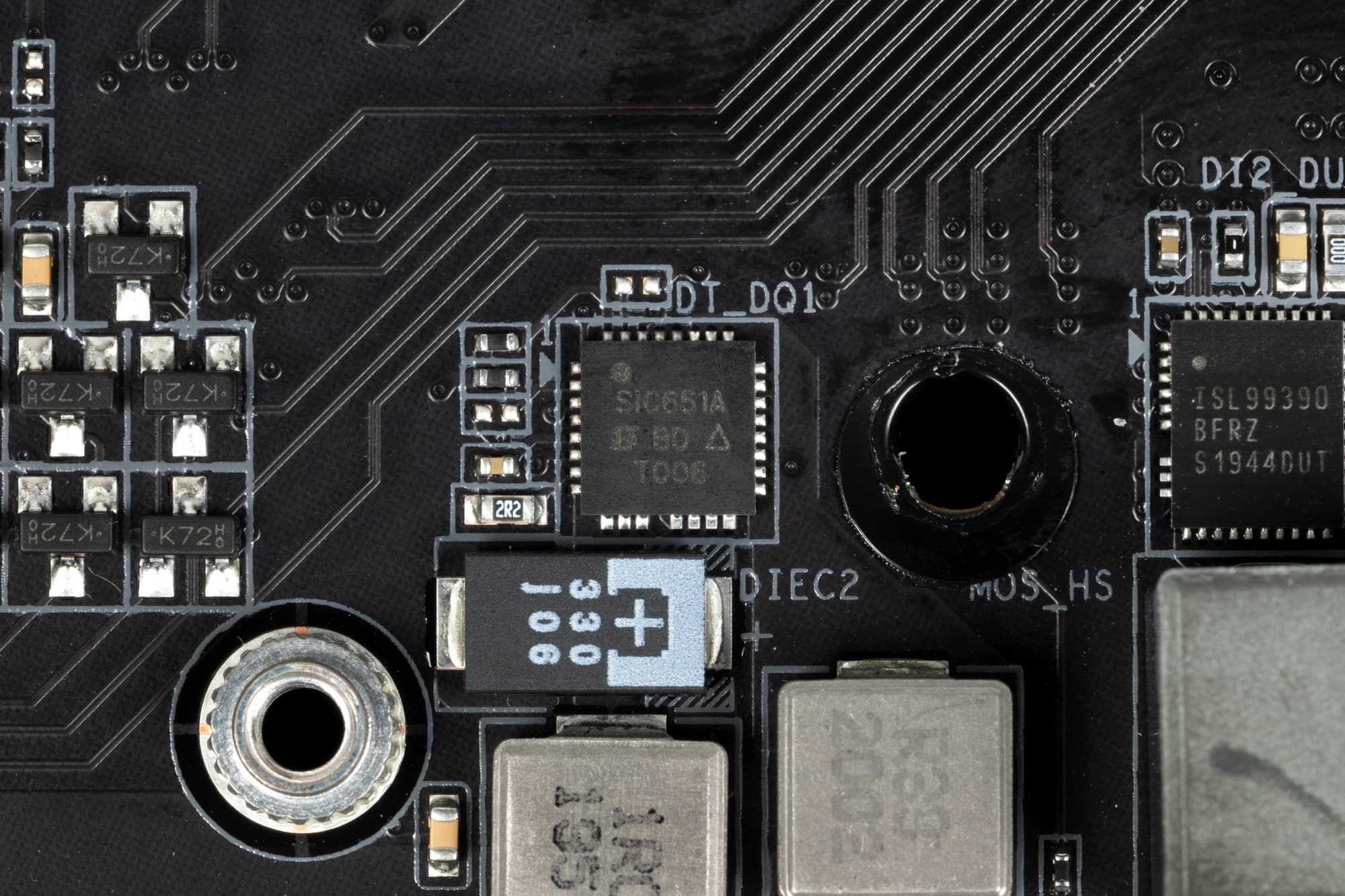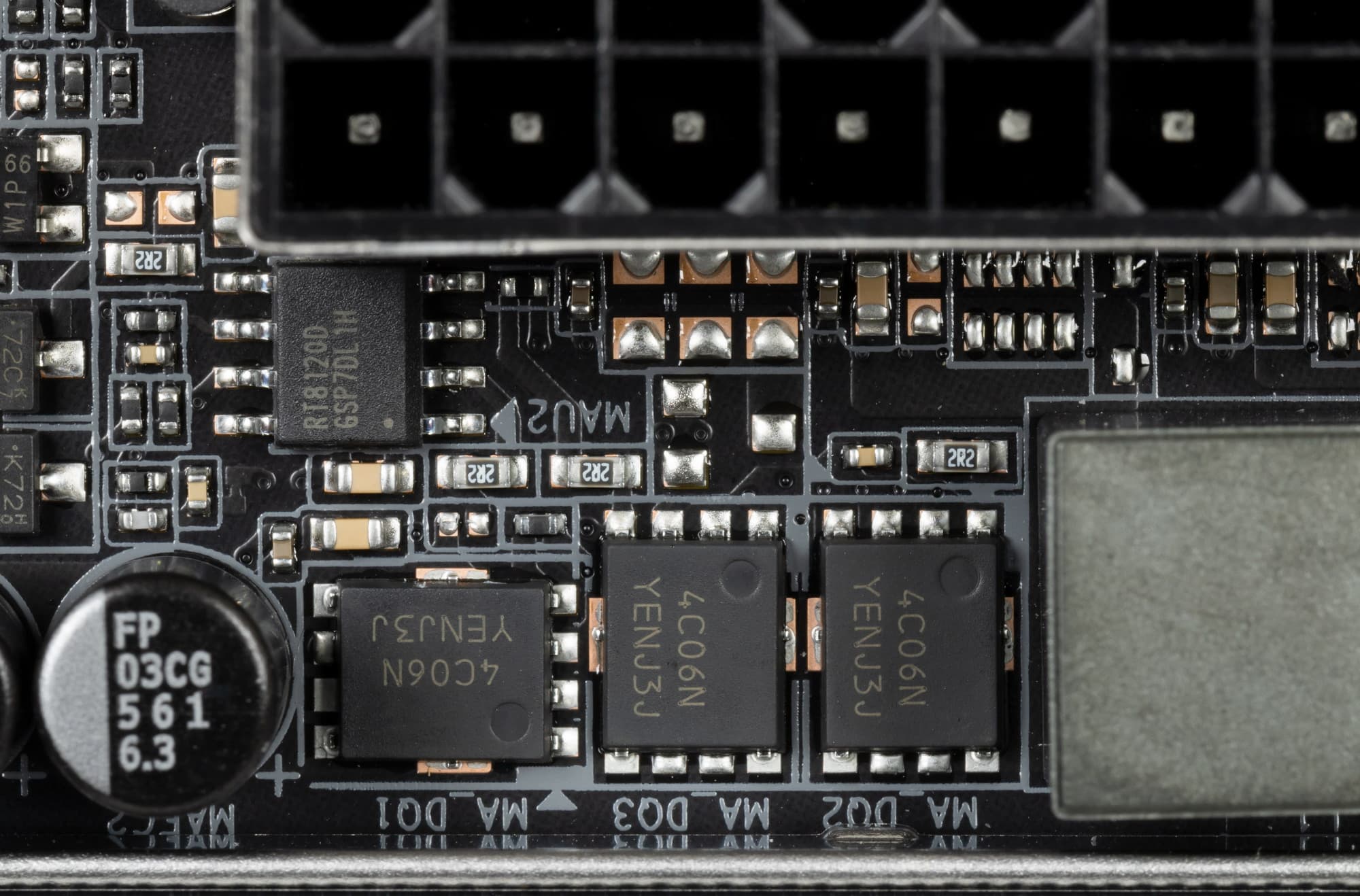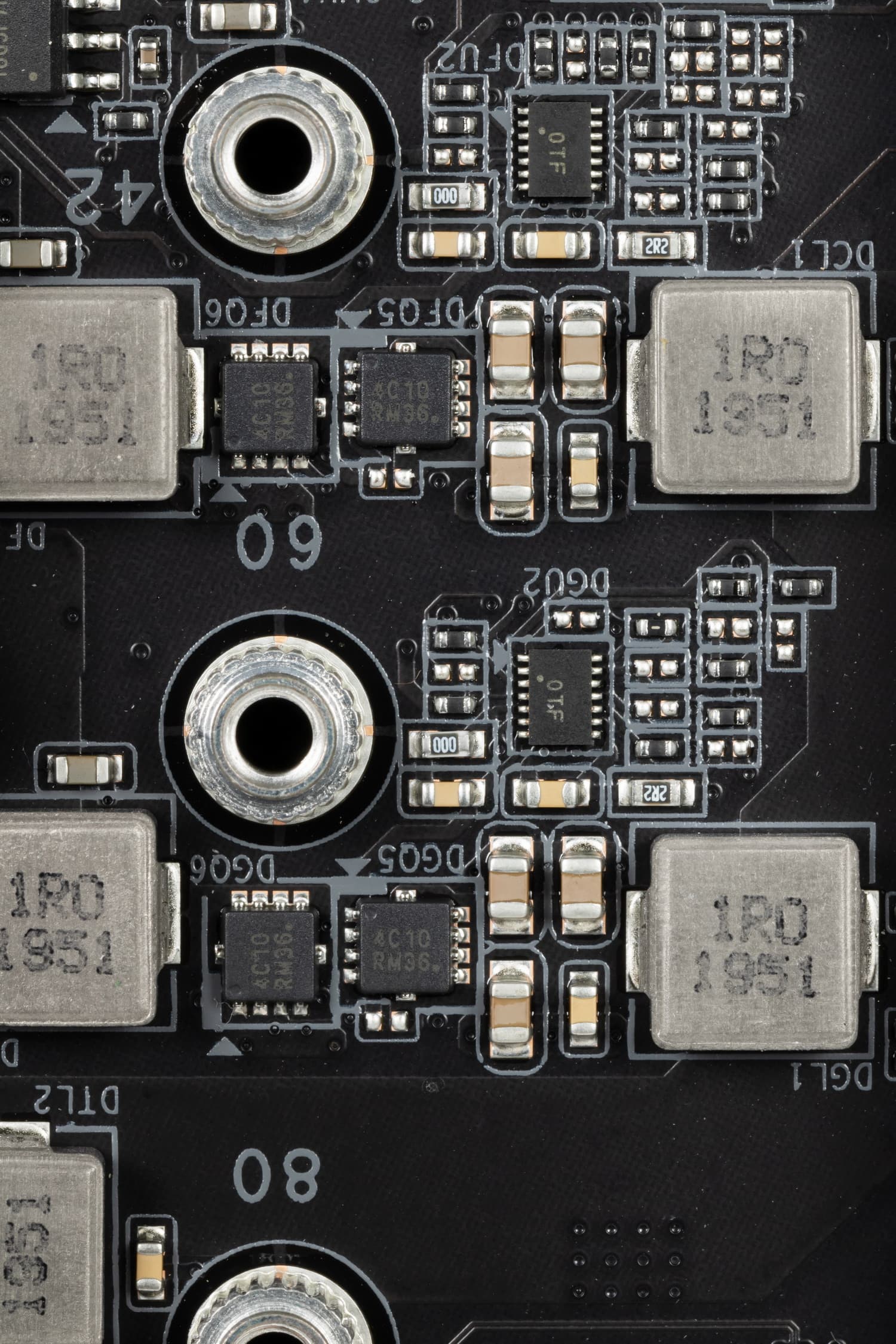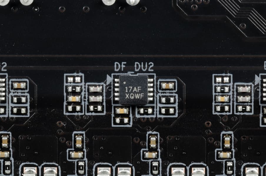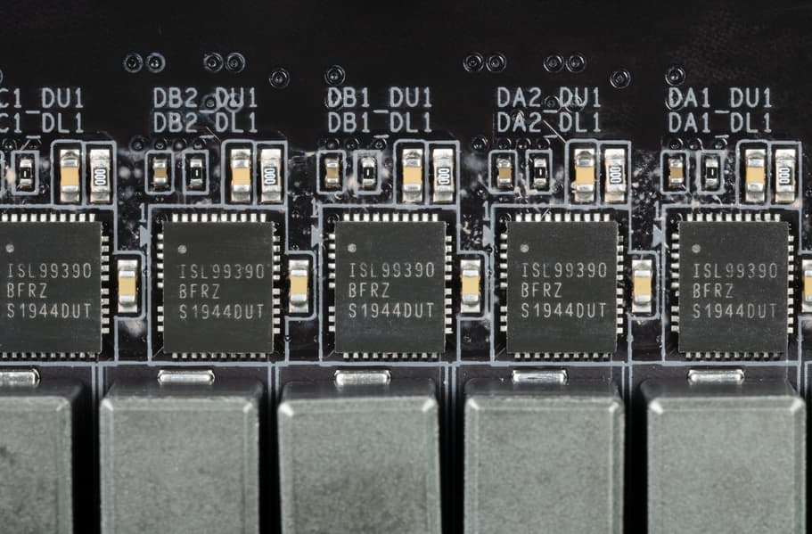 Каждый канал фазы имеет суперферритовый дроссель и ISL99390 MOSFET от Renesas (ex Intersil) на 90 А.