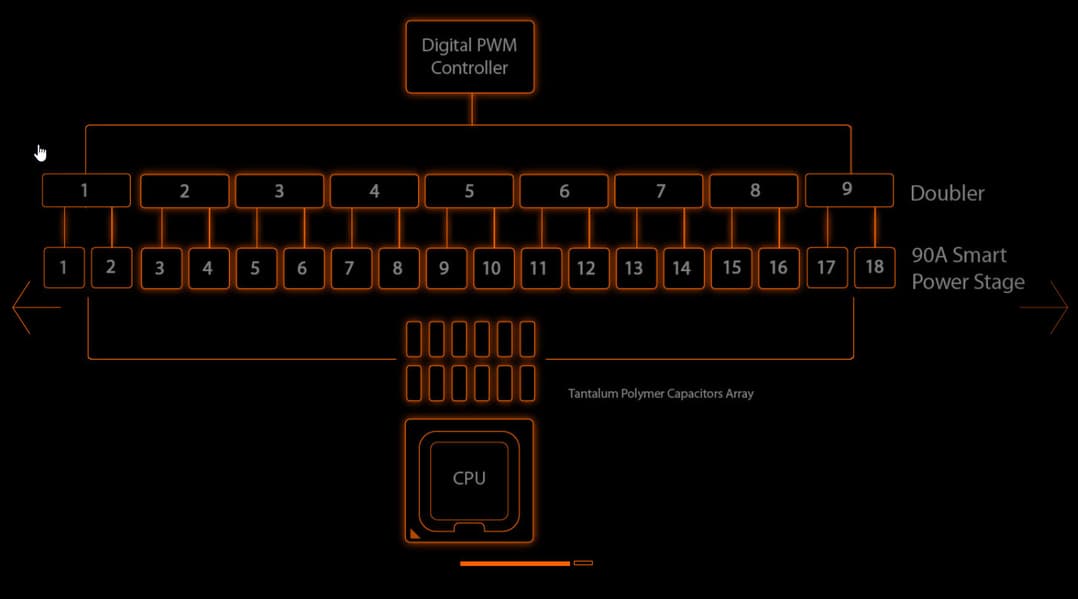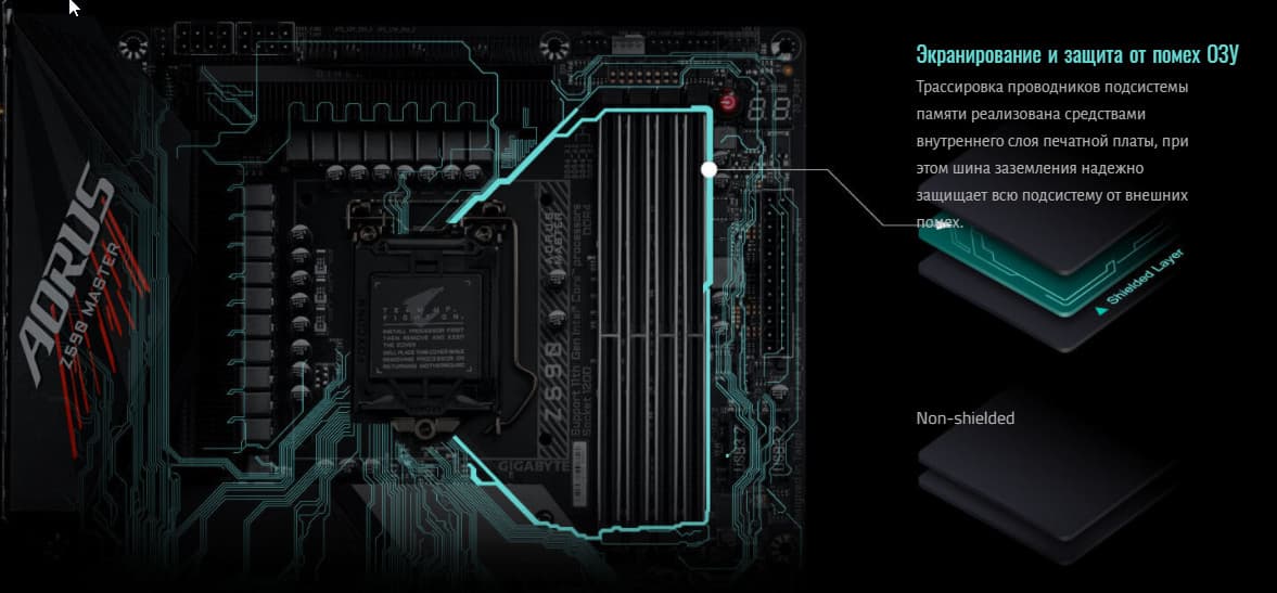 Вообще, традиционно уже Gigabyte в материнских платах флагманского уровня использует свою Ultra Durable технологию, предусматривающую удвоенный слой меди в цепях питания и заземления, помогающую не только улучшению прохождения сигналов (удалению помех), но и более эффективное теплорассеивание.