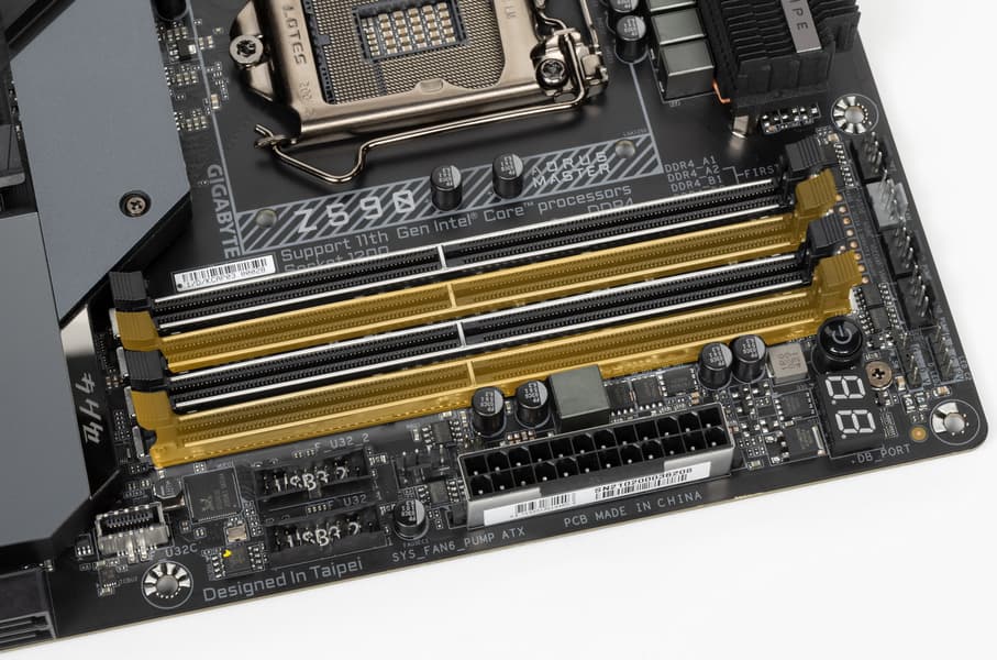 Для установки модулей памяти на плате Gigabyte имеется четыре DIMM-слота (для работы памяти в Dual Channel в случае использования всего 2 модулей их следует устанавливать в А2 и B2. Плата поддерживает небуферизованную память DDR4 (non-EСС), а максимальный объем памяти составляет 128 ГБ (при использовании UDIMM последнего поколения по 32 ГБ). Разумеется, поддерживаются профили XMP.