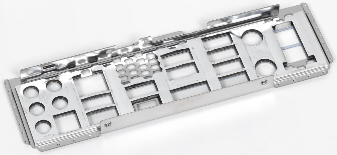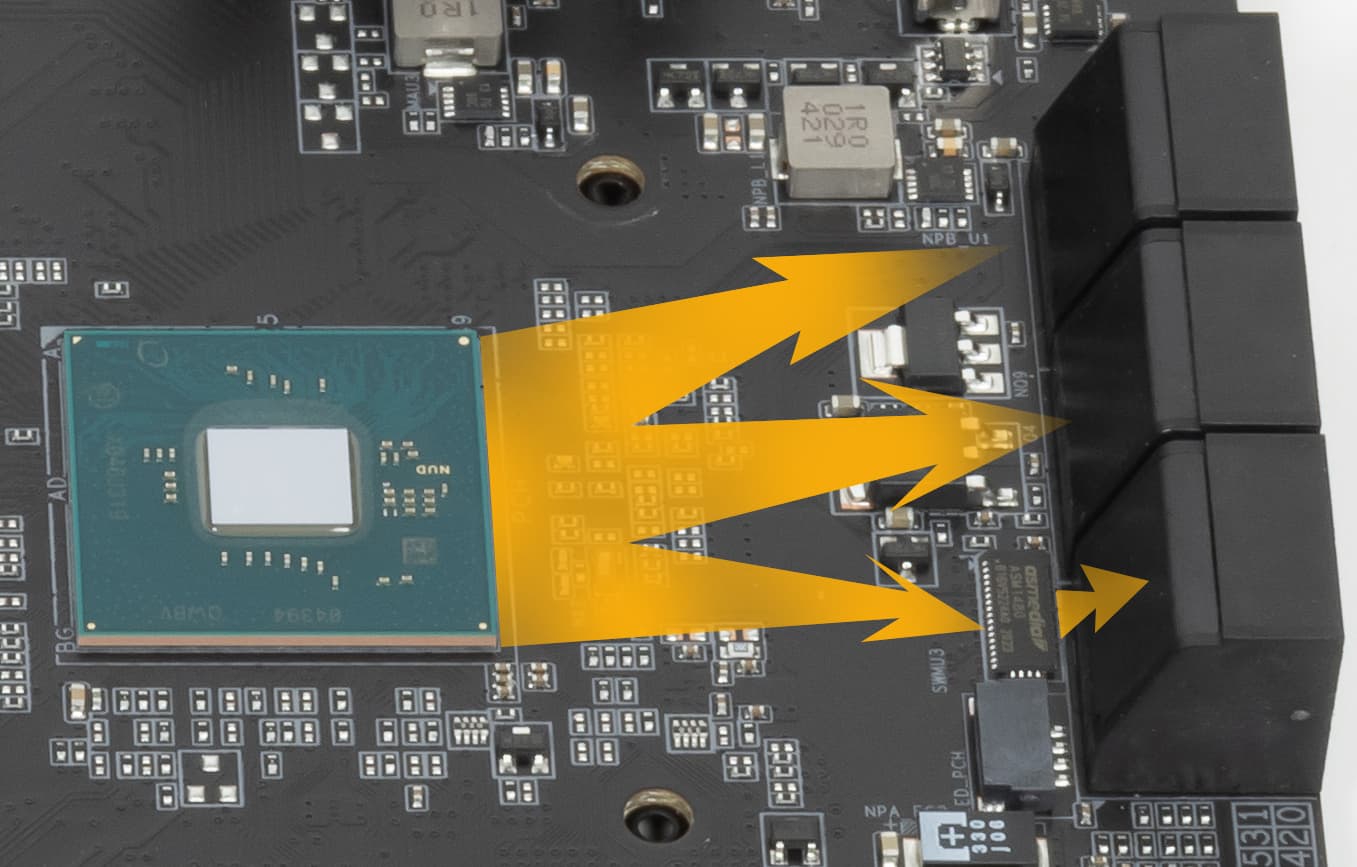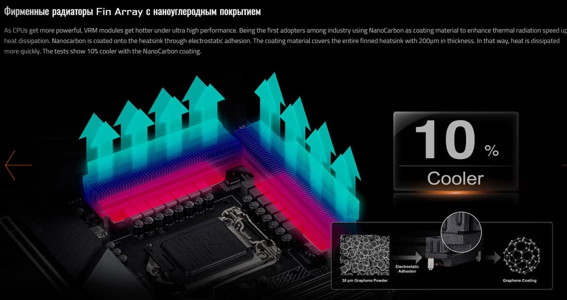 Эти радиаторы VRM, названные Fin Array имеют особые свойства: покрыты специальным наноуглеродным (или нанокарбоновым) слоем, улучшающим теплосъем. А также мы видим маленький вентилятор, установленный под кожухом задних портов. Если посмотрите на фото этой панели выше, то можно увидеть вентиляционную решетку между портами для вывода теплого воздуха.