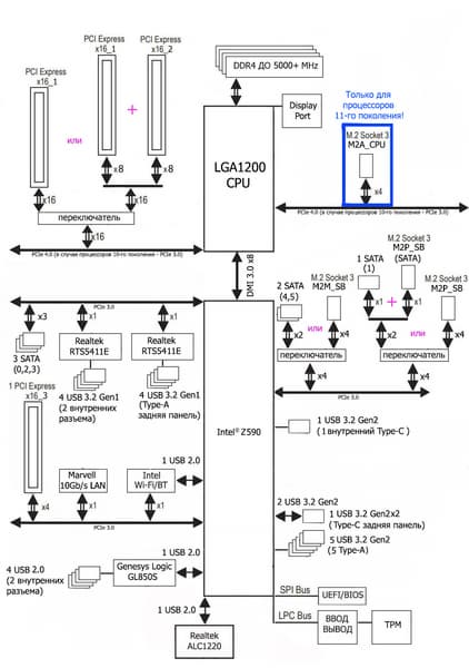 Процессоры Intel Core 11-го поколения (совместимые с сокетом LGA1200 и поддерживаемые Z590) имеют 20 линий ввода-вывода PCIe 4.0, не имеют USB и SATA портов. При этом взаимодействие с Z590 идет по особому каналу Digital Media Interface 3.0 (DMI 3.0), который в Z590 ускорен в 2 раза. Все PCIe линии процессора идут на слоты расширения PCIe и порт М.2. Serial Peripheral Interface (SPI) используется для взаимодействия с системой UEFI/BIOS, а шина Low Pin Count (LPC) — для связи с устройствами ввода/вывода, не требующими высокой пропускной способности (контроллерами вентиляторов, TPM, старой периферии). Процессоры Intel Core 10-го поколения (совместимые с сокетом LGA1200 и поддерживаемые Z490/590) имеют 16 линий ввода-вывода PCIe 3.0, которые идут только на слоты расширения PCIe.