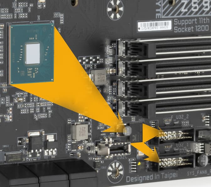Да, в целом все то же самое: всего 30 высокоскоростных портов, но при этом добавилось до 3х интегрированных USB 3.2 Gen2x2 (до 20 Gb/s) портов (правда каждый из них требует поддержки со стороны двух USB 3.2 Gen2, поэтому их стало до 10 штук вместо 8 в Z490). Поддержка аудиотракта с внутреннего канала HDA перешла на USB 2.0 (собственно, один из имеющихся 14 портов такого типа теперь всегда привязан к этой функции). Понятно, что основное новшество в платформу Rocket-Lake-S вносит 11е поколение процессоров, имеющих уже поддержку PCIe 4.0 в виде 20 линий (а не 16 линий PCIe 3.0, как у предыдущих поколений), поэтому это дает возможность свободно организовывать М.2 слоты, получающие данные непосредственно от процессора, причем через PCIe 4.0 (наконец-то SSD Gen4 смогут получить больший спрос).