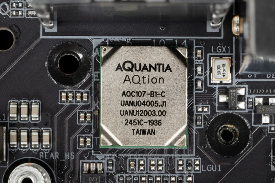 Материнская плата оснащена средствами связи очень даже хорошо. Имеется скоростной Ethernet-контроллер Marvell (ex Aquantia) AOC107, способный работать по стандарту 10 Гбит/с.
