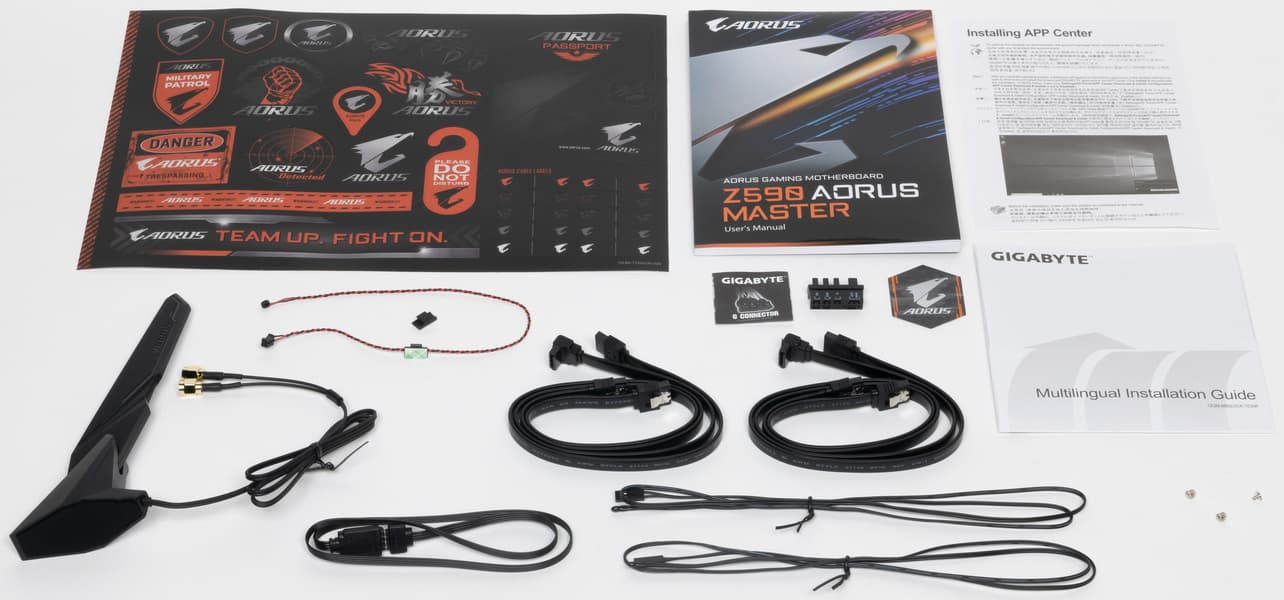 Комплект поставки неплох: кроме традиционных элементов типа руководства пользователя и кабелей SATA, имеются антенна встроенного Wi-Fi-модуля на магнитном основании, винтики для М.2 слотов, разветвители для подключения подсветок, фирменный адаптер G-Connector, провода с термодатчиками, детектор шума, бонусные стикеры.