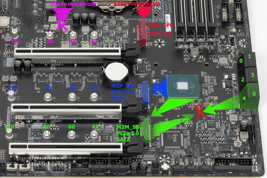 Так же самый нижний M2M_SB взаимоисключает совместную работу с портами SATA_4 и SATA_5. И только верхний M2A_CPU не делит ресурсы ни с чем.
