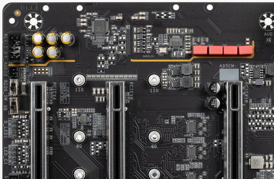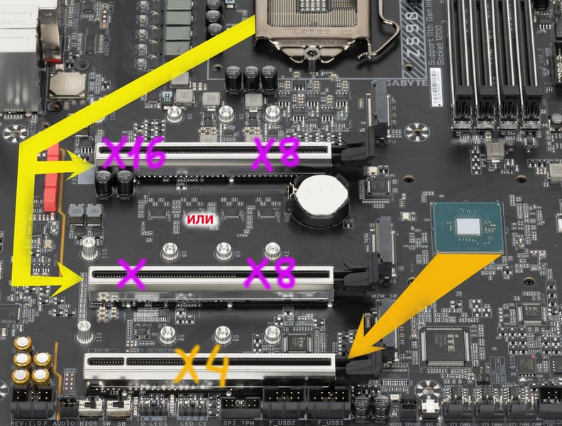 Всего на плате есть три PCIe x16 (для видеокарт или других устройств). Если про первые два PCIe x16 я выше уже рассказал (они подключены к CPU), то третий PCIe x16_3 подключен к Z590, и он рассчитан на режим только х4. То есть аппаратно режим х16 поддерживает только первый слот.