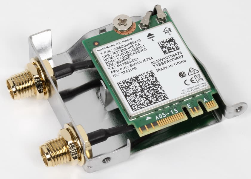Имеется и комплексный беспроводной адаптер на контроллере Intel AX-210NGW, через который реализованы Wi-Fi 6E (802.11a/b/g/n/ac/ax) и Bluetooth 5.2. Он установлен в слот M.2 (E-key), и его разъемы для привинчивания выносных антенн выведены на заднюю панель. Антенна уникальна тем, что имеет магнитное основание и в случае корпуса с металлическим верхом надежно крепится на нем.
