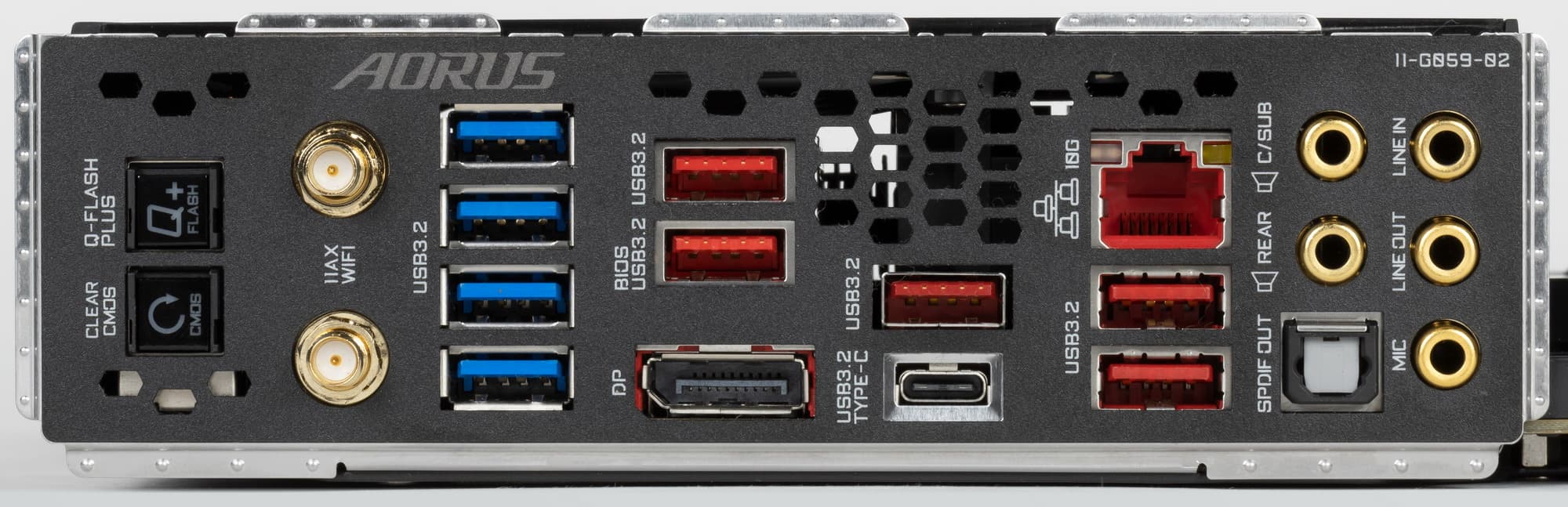 - 6 портов USB 3.2 Gen2: все реализованы чисто через Z590 и 5 представлены на задней панели портами Type-A (красного цвета); еще 1 представлен внутренним портом Type-C (для подключения к соответствующему разъему на передней панели корпуса);
