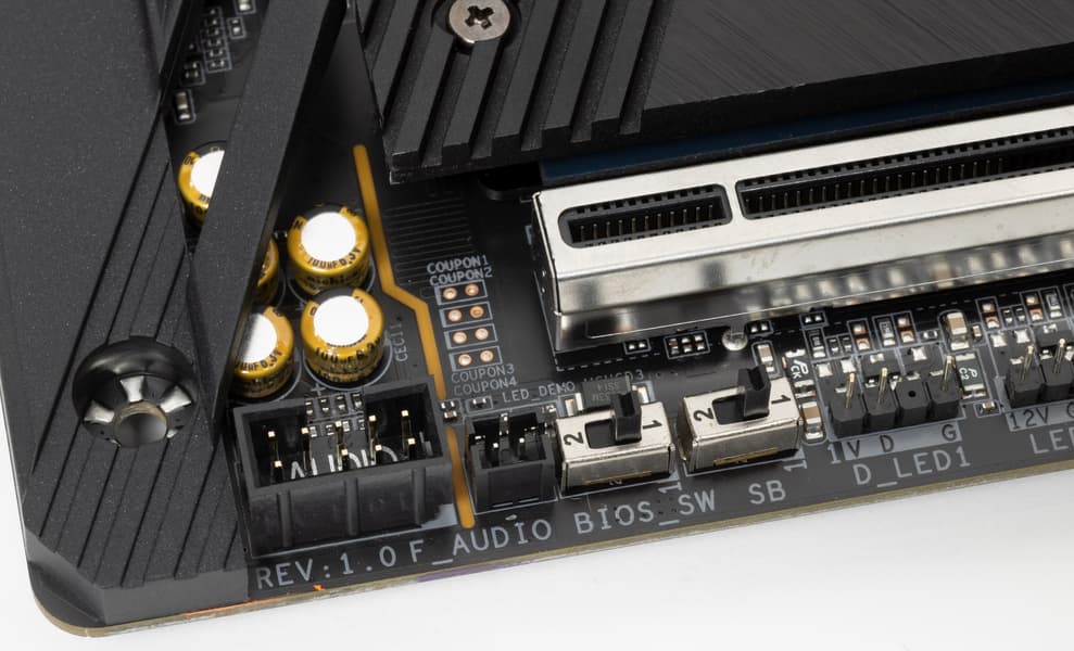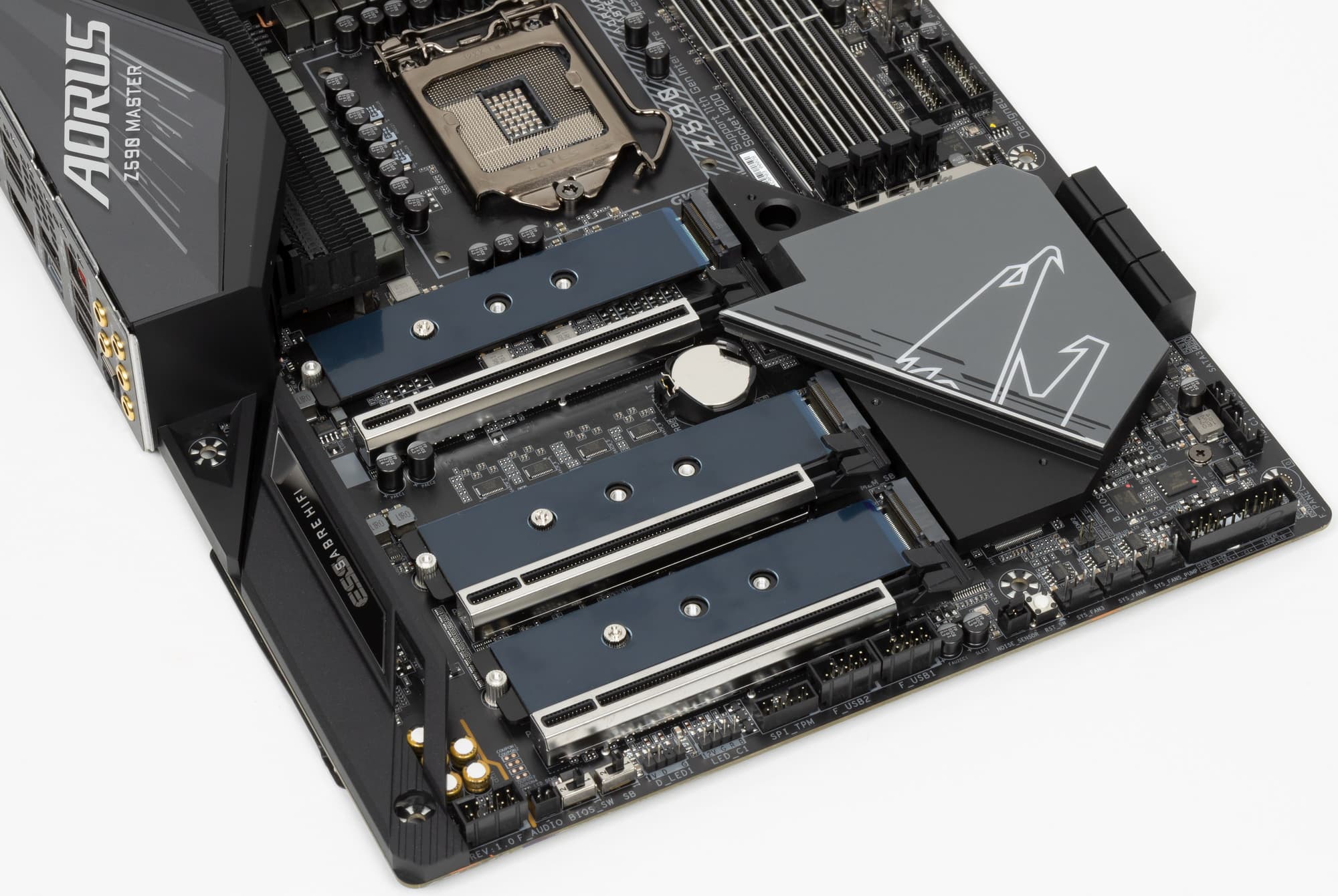 Как я уже упоминал ранее, M.2 слоты также имеют радиаторы: у верхнего — свой персональный радиатор, у двух остальных — общий.