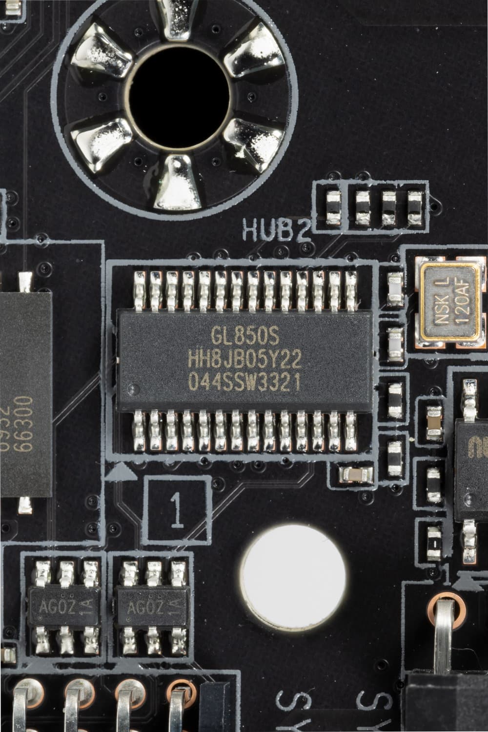 - 4 порта USB 2.0/1.1: все реализованы через контроллер Genesys Logic GL850S (на него потрачена 1 линия USB 2.0) и представлены двумя внутренними разъемами (каждый на 2 порта, подключение через адаптер).