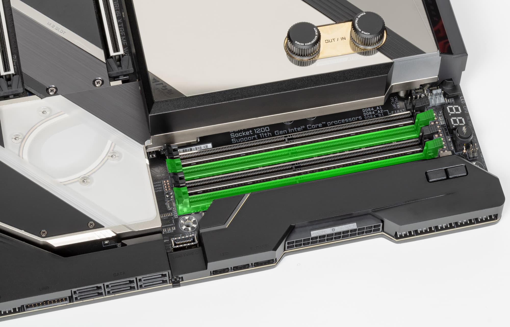 Единый водоблок охлаждает все! И чипсет Z590, и слоты M.2, и преобразователи питания VRM всех видов, и, разумеется, сам процессор.