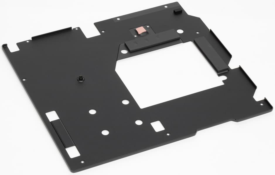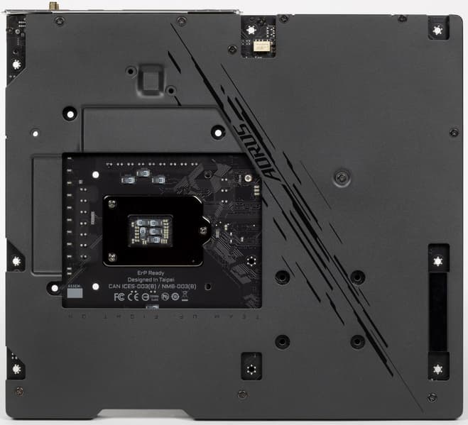 На оборотной стороне элементы имеются, в частности, ряд контроллеров, удвоители и другая мелкая логика. Обработан текстолит очень хорошо: во всех точках пайки не только острые концы срезаны, но и все гладко отшлифовано. С той же стороны установлена пластина из алюминия с наноуглеродным покрытием. Также пластина помогает отводить тепло от задней стороны PCB через термоинтерфейс и обеспечивает жесткость материнской платы. И даже сняв эту пластину, приятно взять в руки такой текстолит. Но я еще раз заострю внимание на том, что такую матплату вряд ли получится установить в корпусе, где в качестве опор для материнских плат используются не привычные всем латунные втулки, а выпрессованные возвышения, которые (по опыту) много шире, нежели выемки в задней пластине у материнки.
