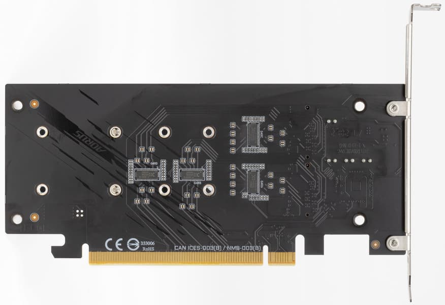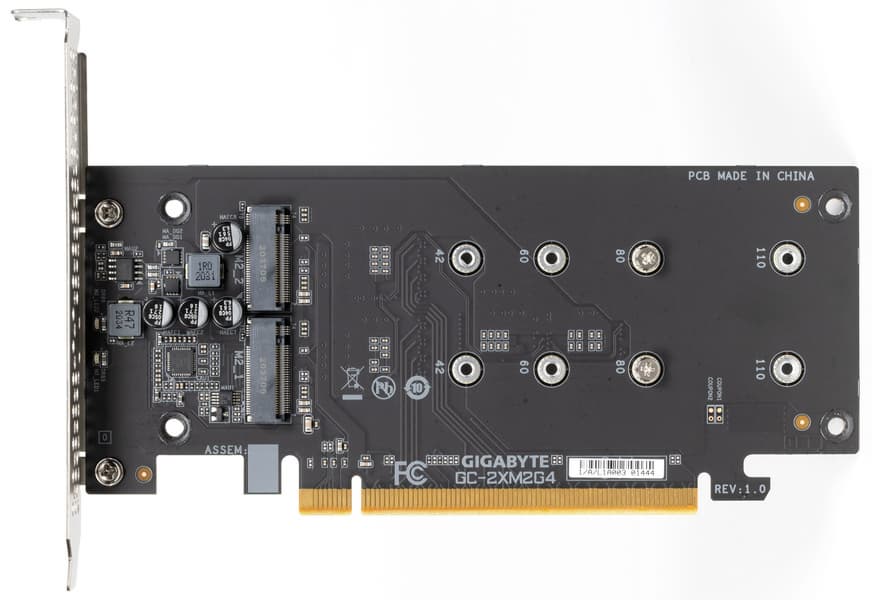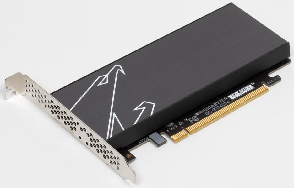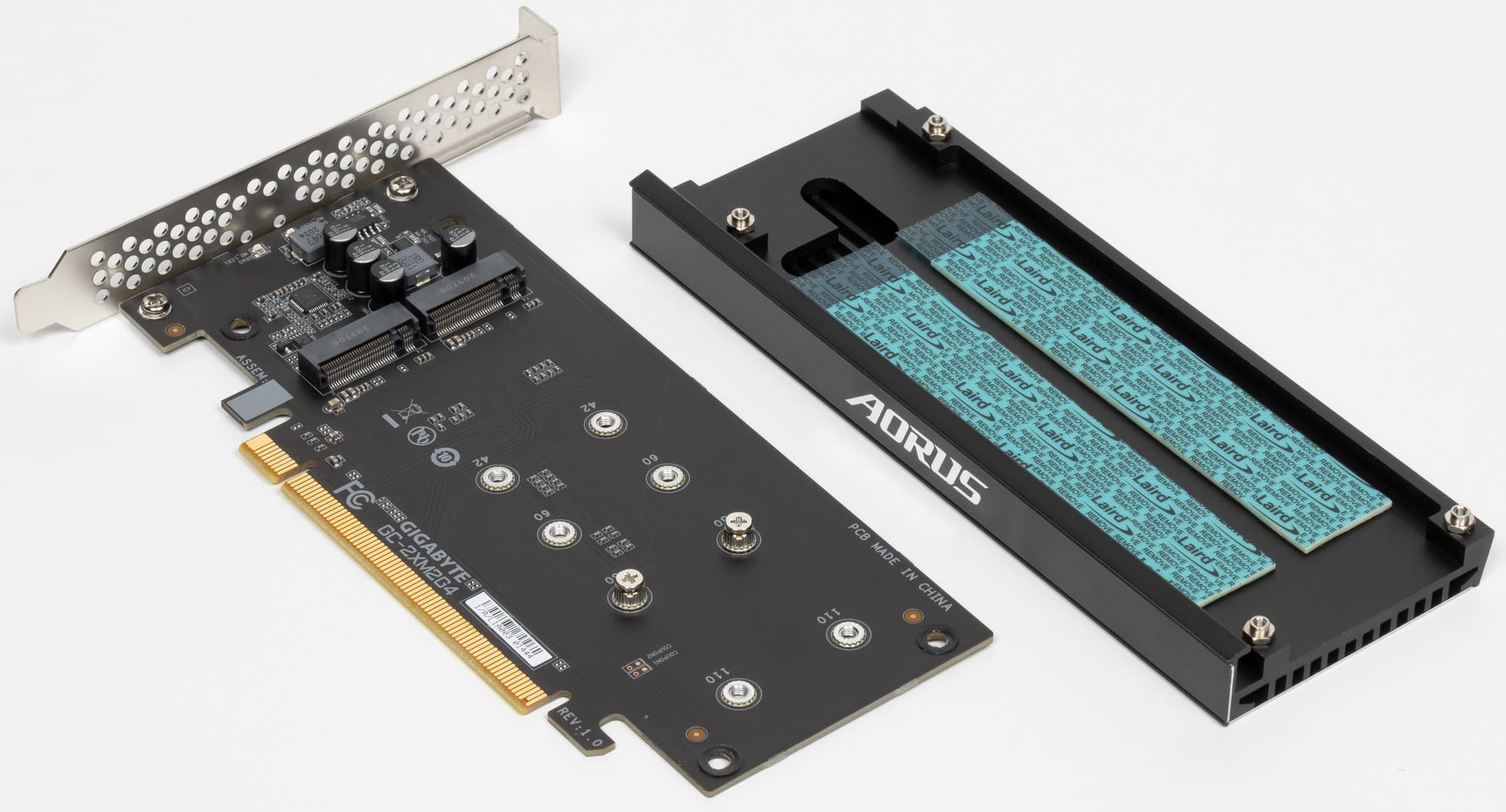 Вы считаете, что три слота М.2 и это все? – Конечно же нет. В комплект поставки с материнкой входит карта расширения PCIe, несущая на себе еще два М.2 порта, которую, в случае необходимости, можно вставить в PCIe x16_2, например (если требуется задействовать сразу два дополнительных М.2). Гнезда на карте имеют свои собственные радиаторы охлаждения.