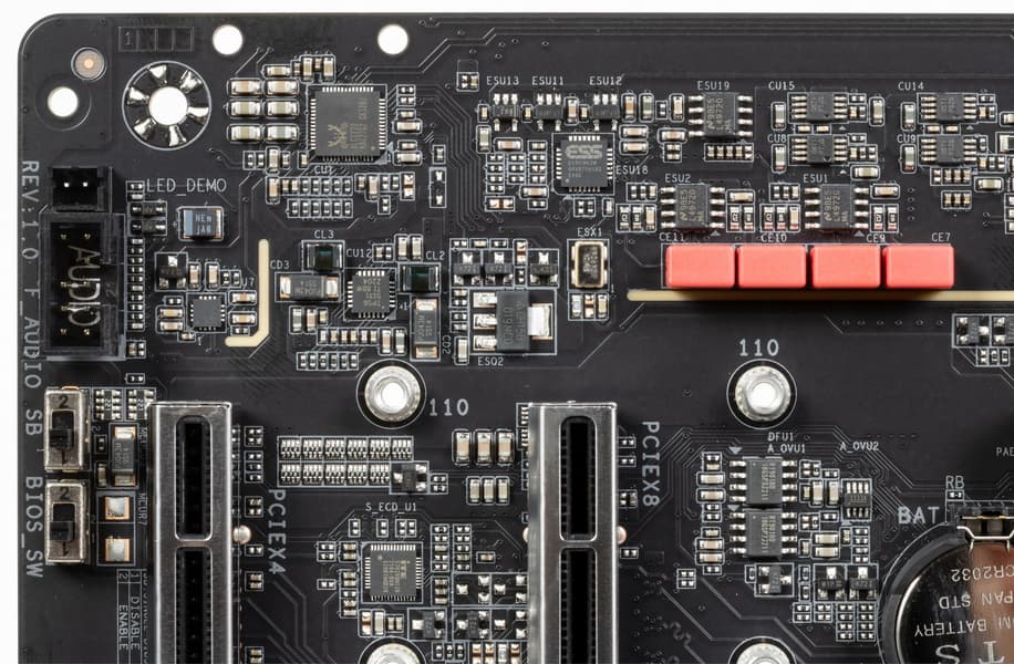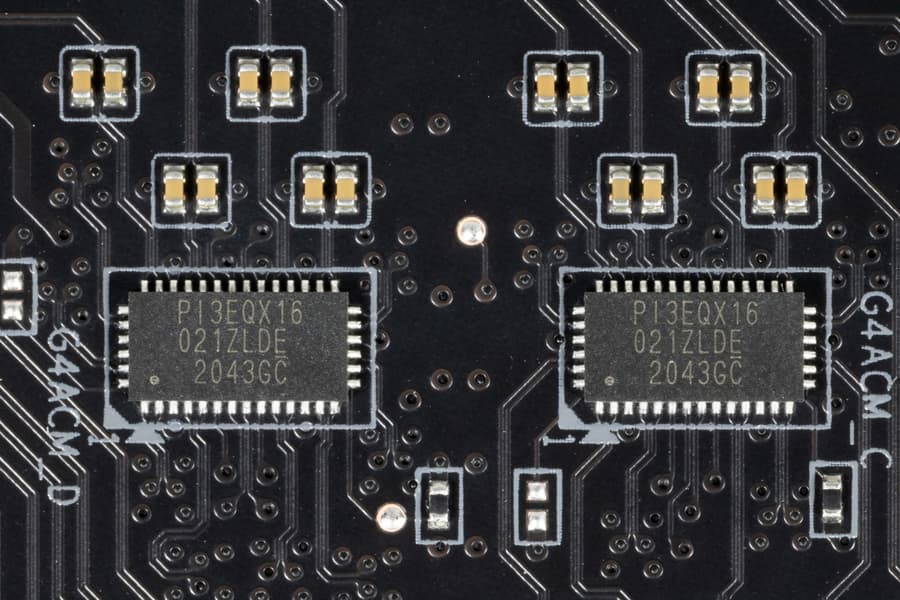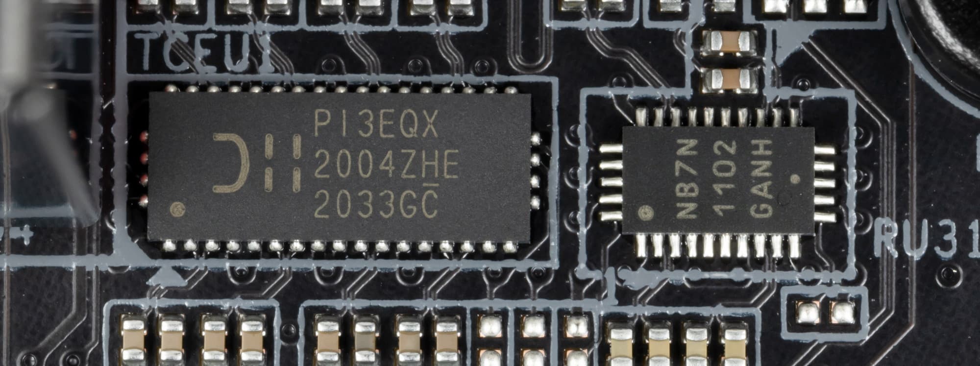 Как видим, перераспределение линий PCIe между слотами у этой материнки имеется, поэтому востребованы мультиплексоры PI3EQX16 от Diodes Inc. (ex Pericom).