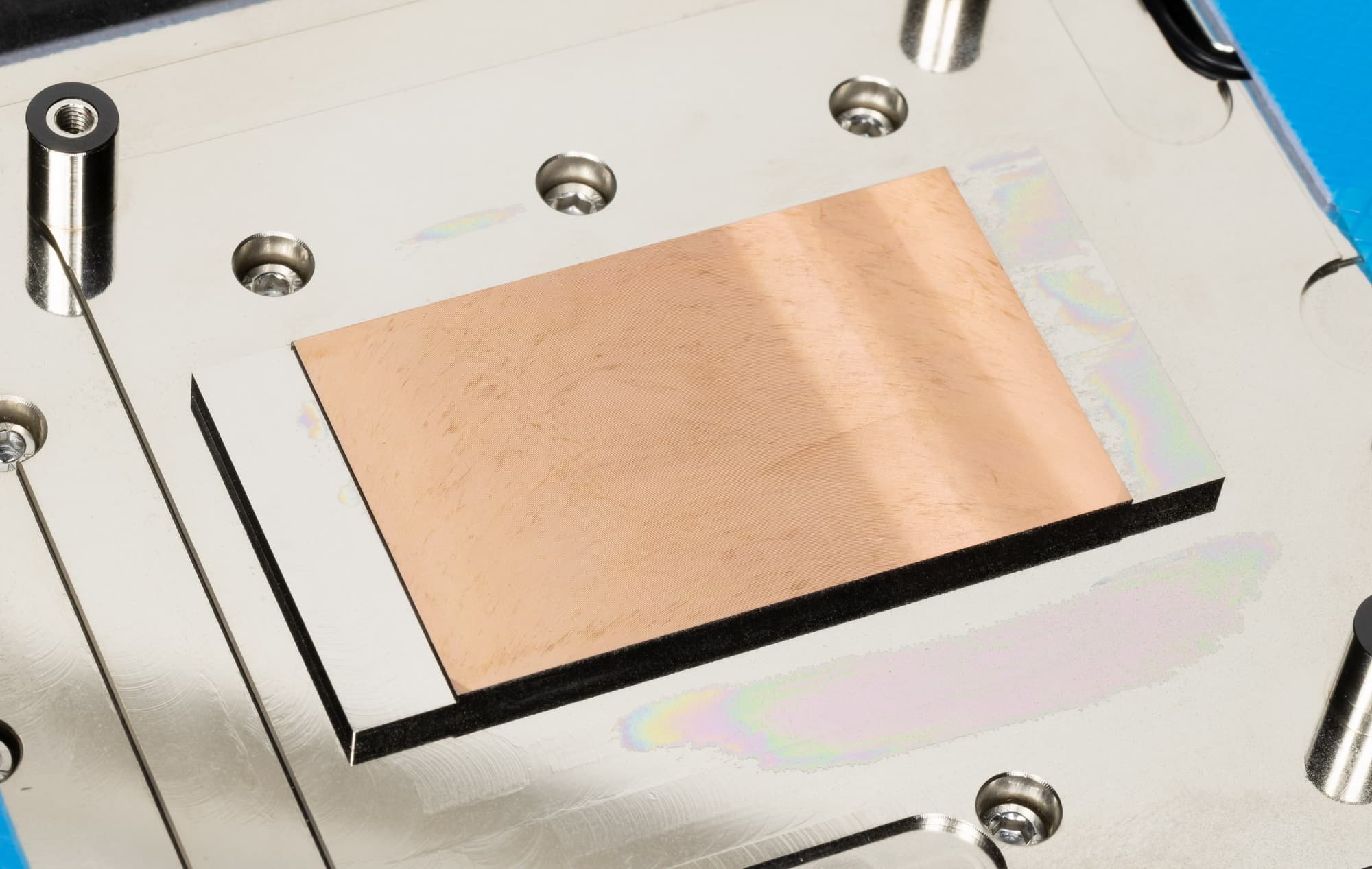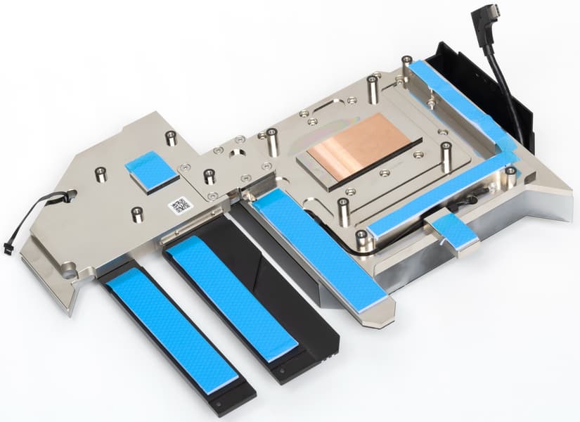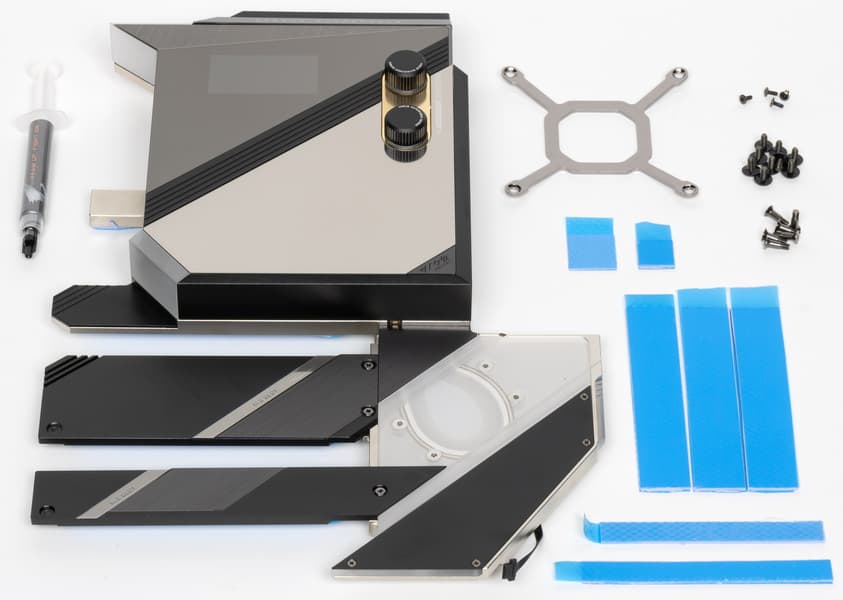 Места прижима к мосфетам, Z590 и даже к сетевому контроллеру Marvel AQC107 имеют мягкий термоинтерфейс. Поэтому элементы термоинтерфейса явно рассчитаны на 1-2 (максимум 3) использования, и в комплекте с водоблоком есть запасной набор этих «серых резинок».
