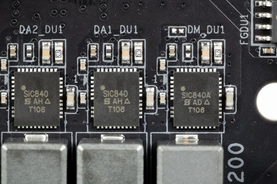 Каждый канал фазы имеет суперферритовый дроссель и SiC840 MOSFET от Vishay на 100 А.