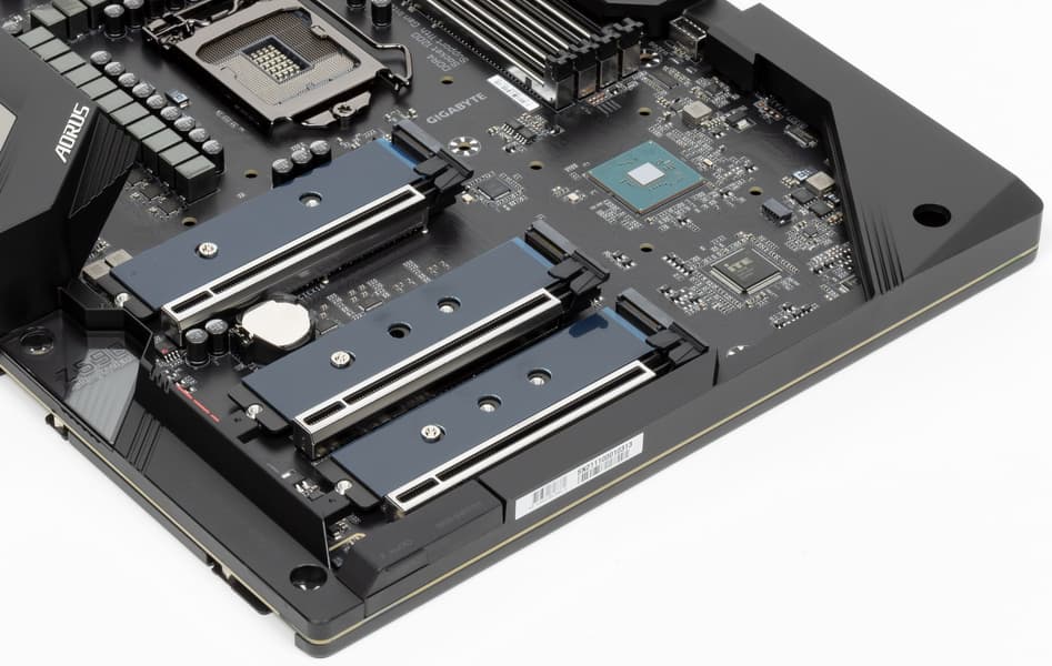 Всего у платы 6 разъемов Serial ATA 6 Гбит/с + 3 слота для накопителей в форм-факторе M.2. Все порты SATA реализованы через чипсет Z590 и поддерживают создание RAID.