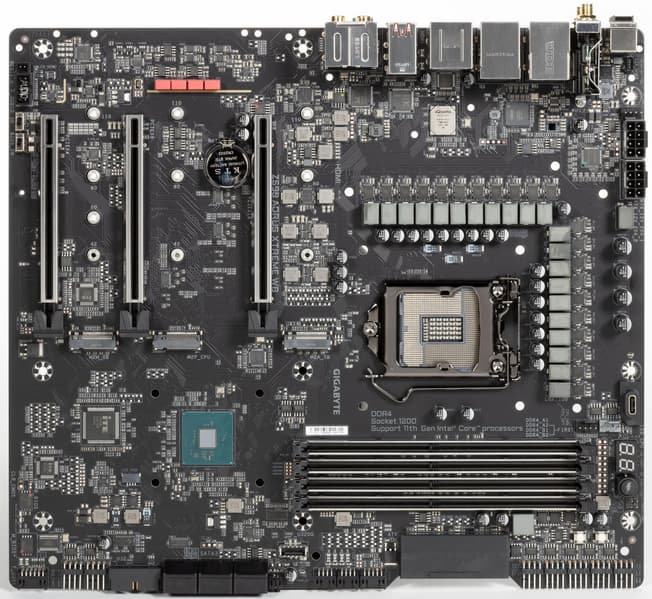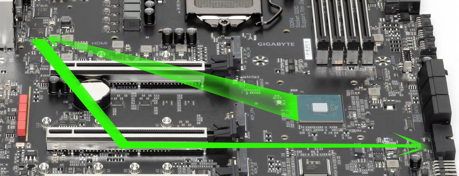 В целом почти все то же самое: всего 30 высокоскоростных портов, но при этом добавилось до 3х интегрированных USB 3.2 Gen2x2 (до 20 Gb/s) портов (правда каждый из них требует поддержки со стороны двух USB 3.2 Gen2, поэтому их стало до 10 штук вместо 8 в Z490). Поддержка аудиотракта с внутреннего канала HDA перешла на USB 2.0 (собственно, один из имеющихся 14 портов такого типа теперь всегда привязан к этой функции). Понятно, что основное новшество в платформу Rocket-Lake-S вносит 11е поколение процессоров, имеющих уже поддержку PCIe 4.0 в виде 20 линий (а не 16 линий PCIe 3.0, как у предыдущих поколений), поэтому это дает возможность свободно организовывать М.2 слоты, получающие данные непосредственно от процессора, причем через PCIe 4.0 (наконец-то SSD Gen4 смогут получить больший спрос).