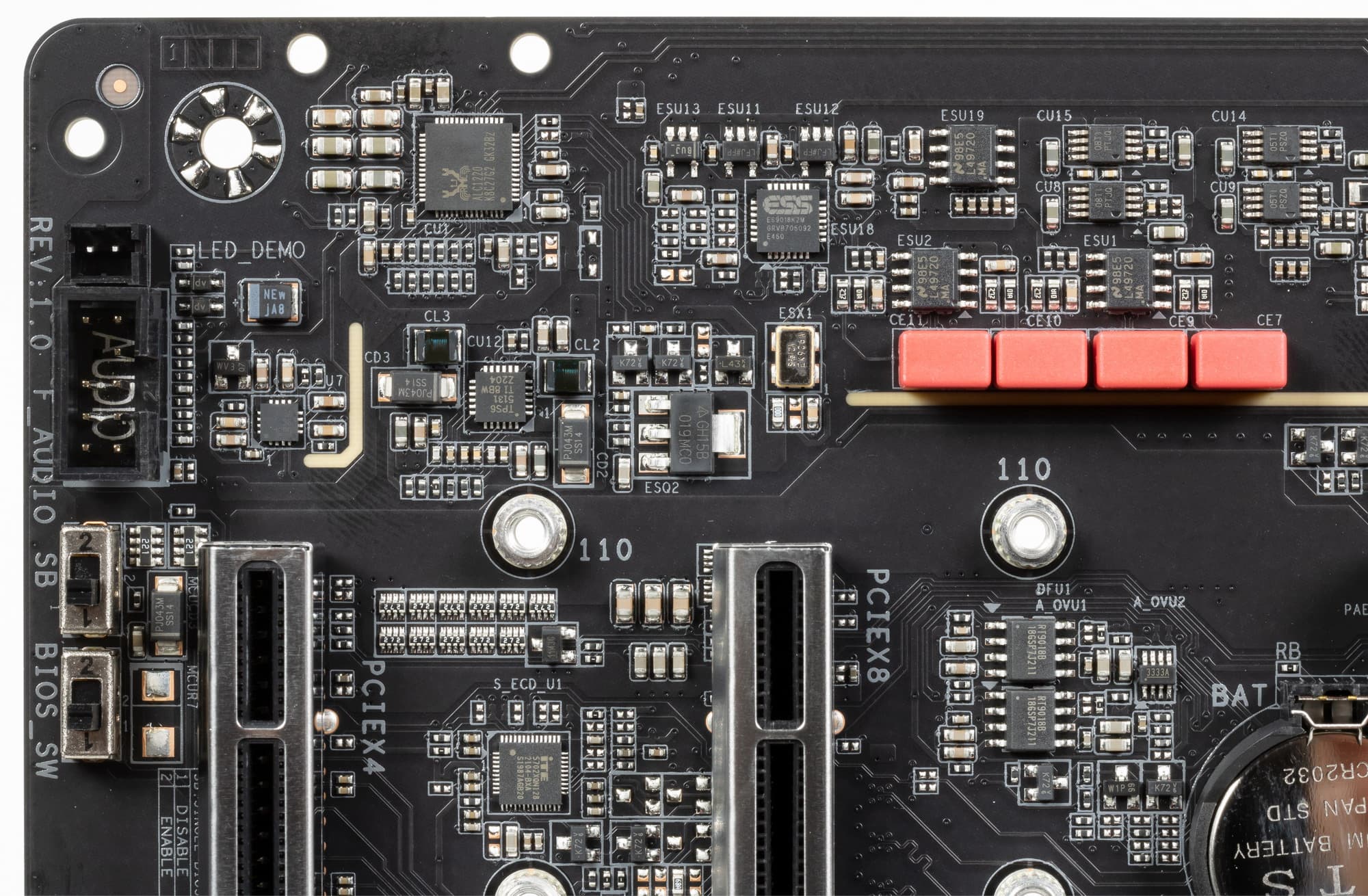 Вообще, традиционно уже Gigabyte в материнских платах флагманского уровня использует свою Ultra Durable технологию, предусматривающую удвоенный слой меди в цепях питания и заземления, помогающую не только улучшению прохождения сигналов (удалению помех), но и более эффективное теплорассеивание.