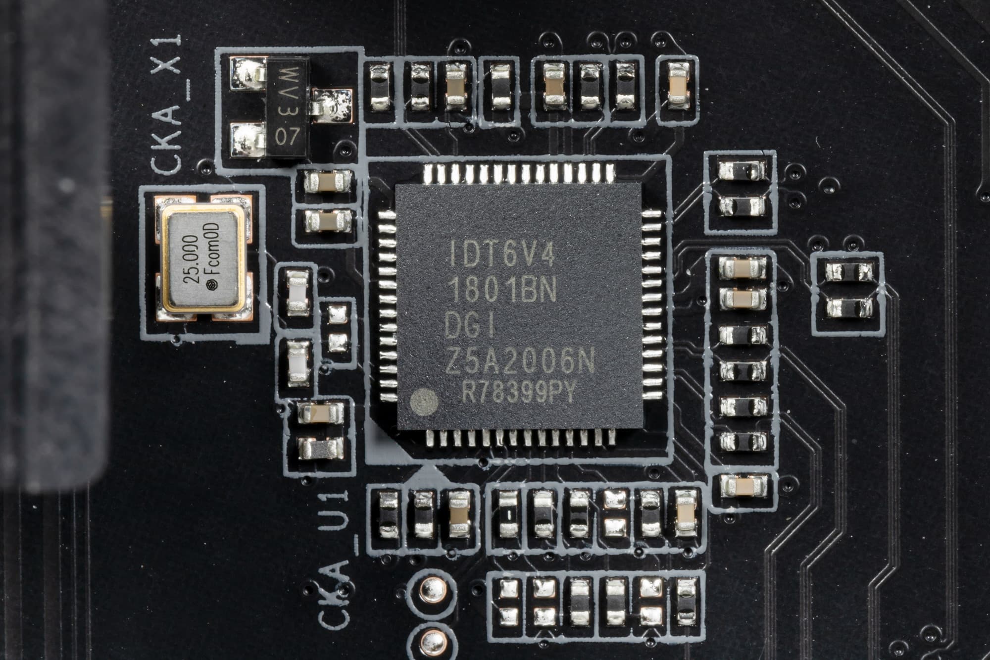 Для поддержания стабильных частот на шине PCIe (и для нужд оверклокеров) имеется внешний тактовый генератор от Renesas (ex IDT).