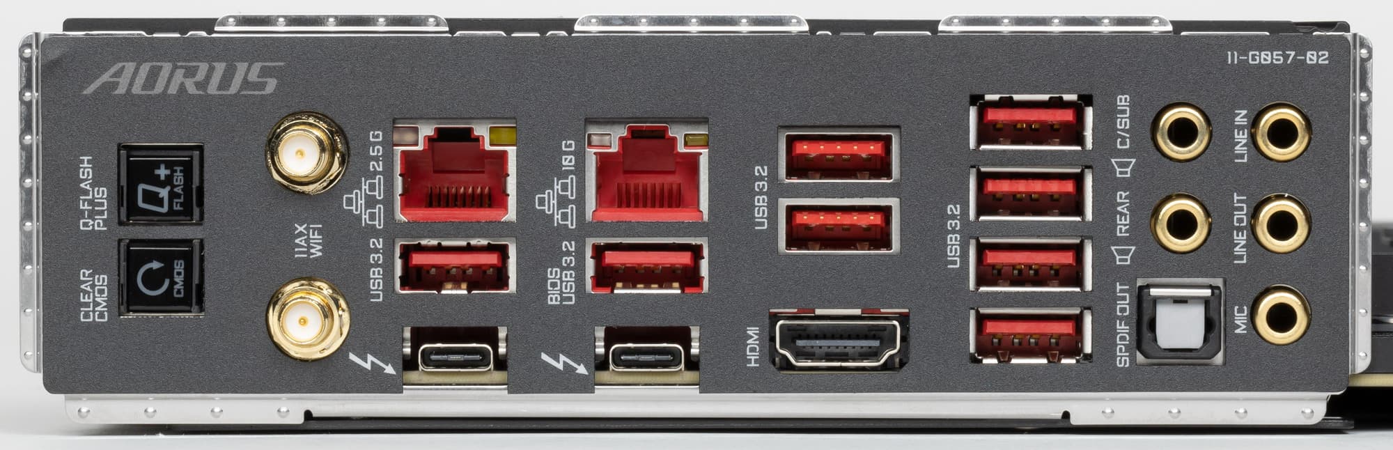 | Разъемы на задней панели | 2 × USB 3.2 Gen2 (Type-C) 8 × USB 3.2 Gen2 (Type-A) 2 × RJ-45 5 аудиоразъемов типа миниджек 1 × S/PDIF (оптический, выход) 1 × HDMI 2.0b 2 антенных разъема (симметричная схема приема-передачи 2T2R) кнопка сброса CMOS кнопка перепрошивки BIOS — Q Flash Plus |