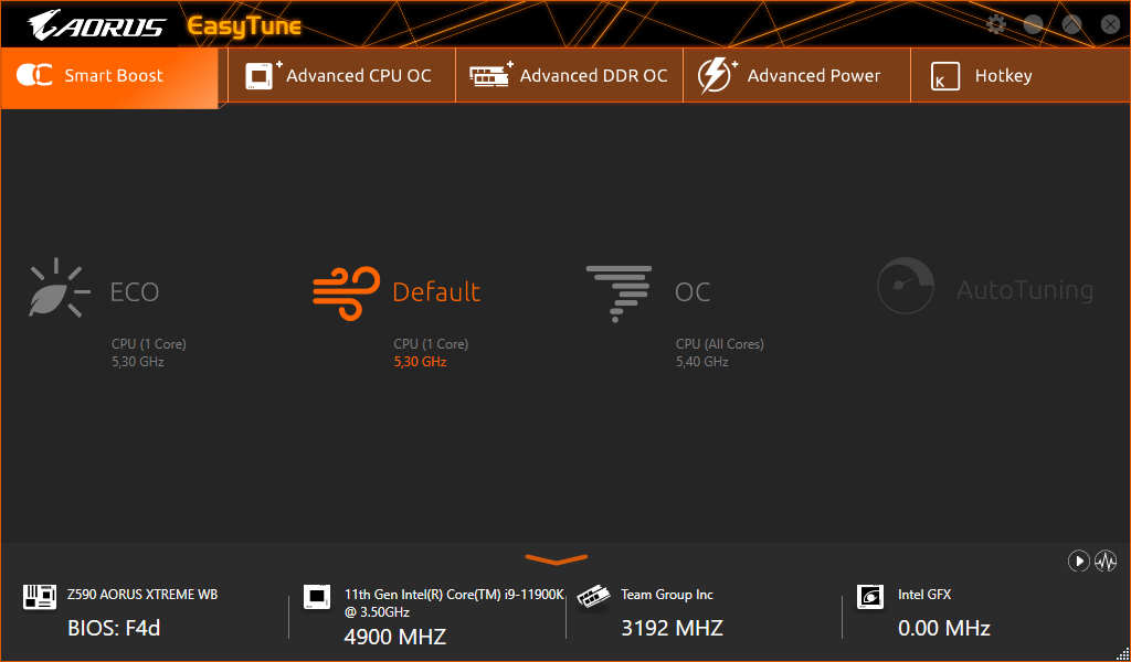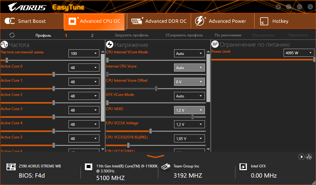 Пробую режим ОС через утилиту Easy Tune (о ней говорил ранее). Там нет четкого задания границ пользователем, берется профиль, ранее созданный специалистами Gigabyte. Что получаем? — попытку задать 5,0 ГГц по всем ядрам, но при этом чрезмерно было завышено напряжение на процессоре, и первый же тест заставил защиту от перегрева скинуть частоты.