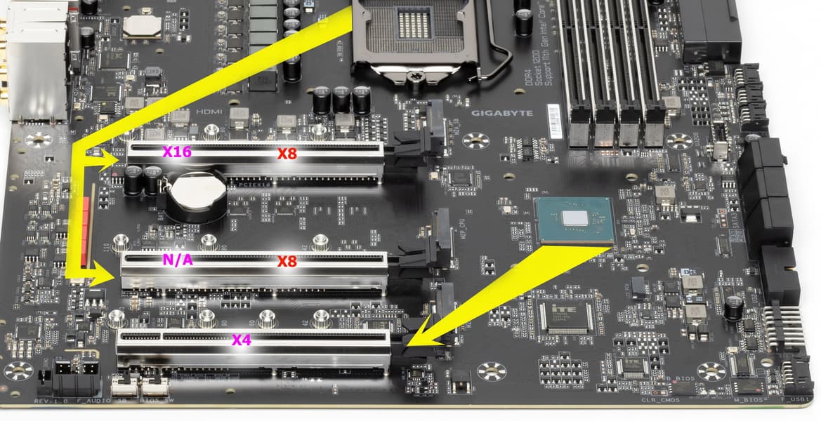 Теперь посмотрим выше на то, как работают процессоры в данной конфигурации. У CPU 11-го поколения всего 20 линий PCIe, 4 из них отведены на порт М.2. У CPU 10-го поколения всего 16 линий (нет выделения линий на М.2 порт). Оставшиеся 16 линий надо делить на два слота PCIe x16 (_1 и _2). Вариантов переключения несколько: