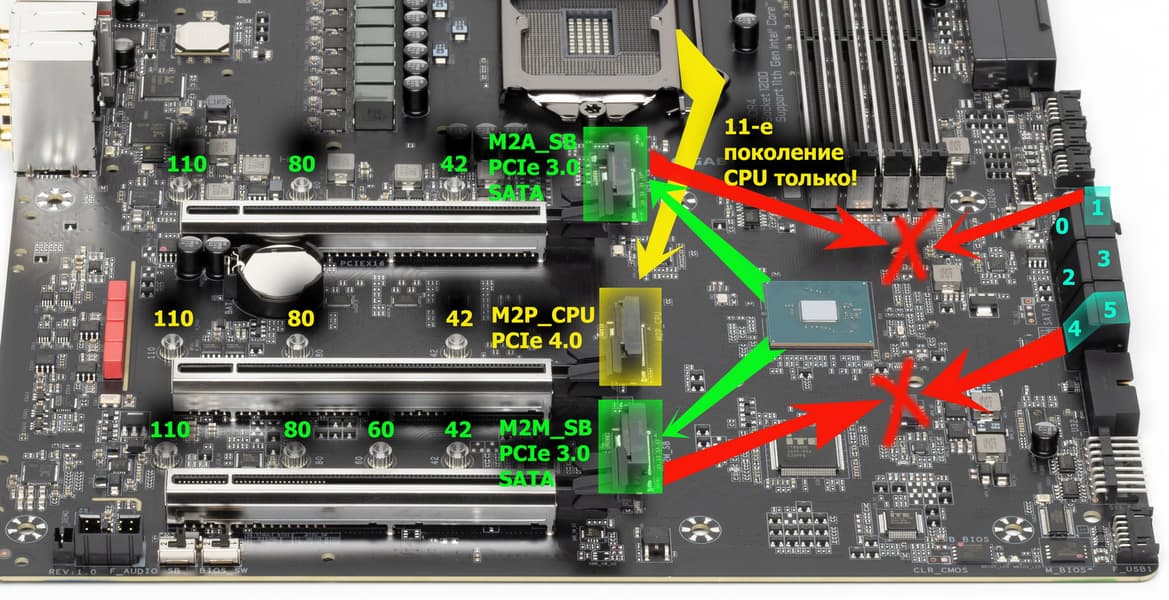 Так же самый нижний M2M_SB взаимоисключает совместную работу с портами SATA_4 и SATA_5. И только средний M2P_CPU не делит ресурсы ни с чем.