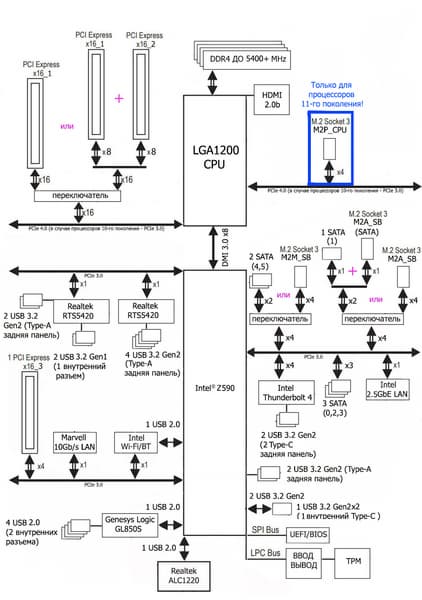Процессоры Intel Core 11-го поколения (совместимые с сокетом LGA1200 и поддерживаемые Z590) имеют 20 линий ввода-вывода PCIe 4.0, не имеют USB и SATA портов. При этом взаимодействие с Z590 идет по особому каналу Digital Media Interface 3.0 (DMI 3.0), который в Z590 ускорен в 2 раза. Все PCIe линии процессора идут на слоты расширения PCIe и порт М.2. Serial Peripheral Interface (SPI) используется для взаимодействия с системой UEFI/BIOS, а шина Low Pin Count (LPC) — для связи с устройствами ввода/вывода, не требующими высокой пропускной способности (контроллерами вентиляторов, TPM, старой периферии). Процессоры Intel Core 10-го поколения (совместимые с сокетом LGA1200 и поддерживаемые Z490/590) имеют 16 линий ввода-вывода PCIe 3.0, которые идут только на слоты расширения PCIe.