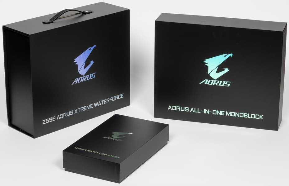 Собственно, плата и ее «близкий» комплект — в большой коробке, которая тоже имеет ручку (подозреваю, что в такой упаковке поставляется родственная плата — Gigabyte Z590 Aorus Xtreme, та, что без водоблока). Мигрирующий от одного к другому комплекту ряда премиальных плат Aorus RGB Fan Commander имеется и здесь. Я уже рассказывал о нем при изучении Gigabyte Z390 Aorus Xtreme, расскажу еще раз и здесь (ниже). Ну и в третьей коробке — сам водоблок. Называемый как Aorus All-in-One Monoblock. Реально крутая штука: до монтажа на плату можно использовать как гантель.
