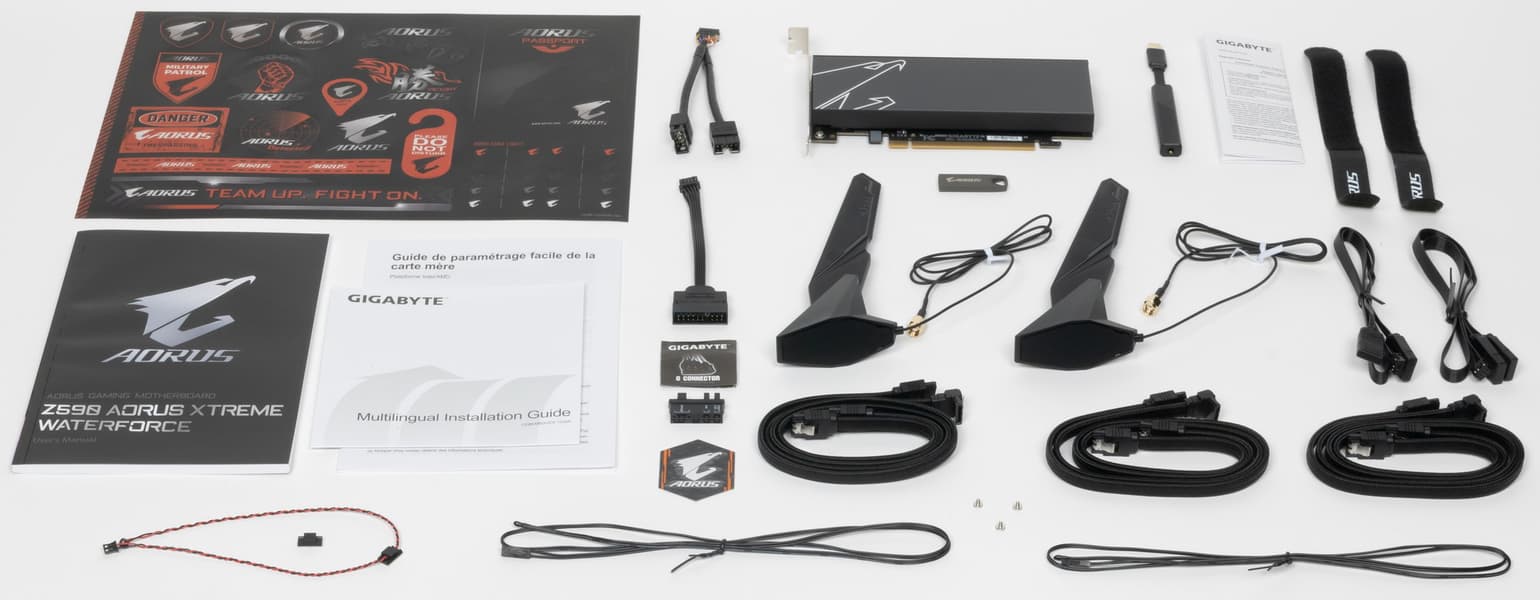 Комплект поставки самой платы (то есть «близкий») весьма обширен: кроме традиционных элементов типа руководства пользователя и кабелей SATA (что уже много лет является обязательным набором ко всем материнкам), имеются накопитель с ПО, две антенны для беспроводной связи, разветвители для подключения подсветок, адаптеры для подключения внутренних USB-портов и передней панели, фирменная карта расширения PCIe для установки дополнительных М.2 накопителей, адаптер G-Connector (о нем позже), провода с термодатчиками, бонусные стикеры, стяжки и Hi-Fi аудио-адаптер (о нем также позже).