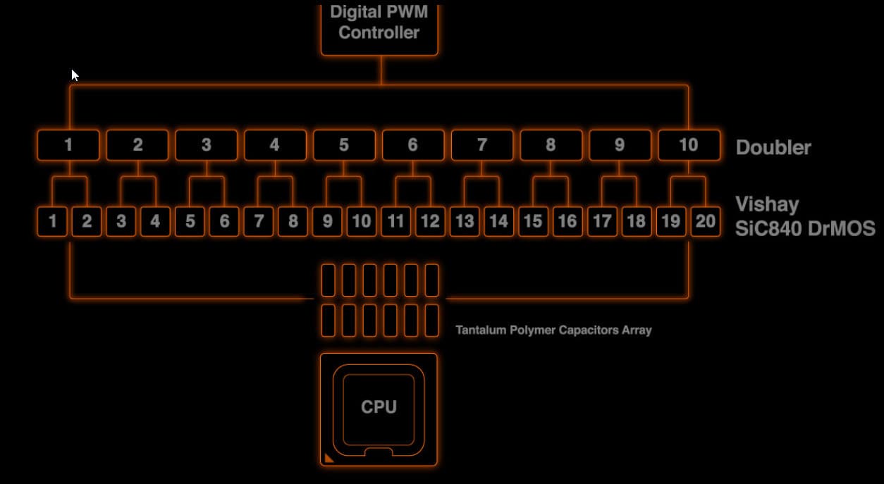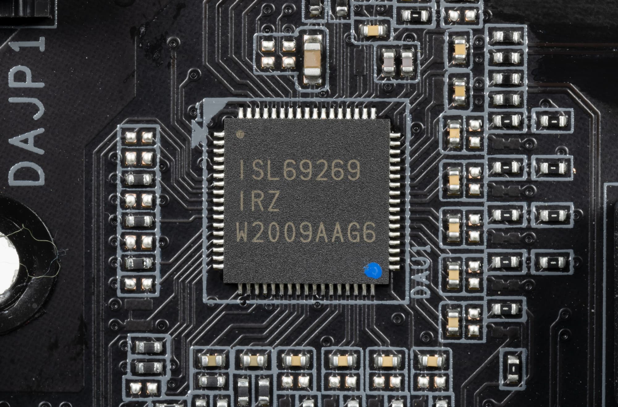 То есть в сумме такая мощнейшая система способна на работу с огромными токами. Управляет схемой ШИМ-контроллер ISL69269 от Renesas (ex Intersil), рассчитанный максимум на 12 фаз.