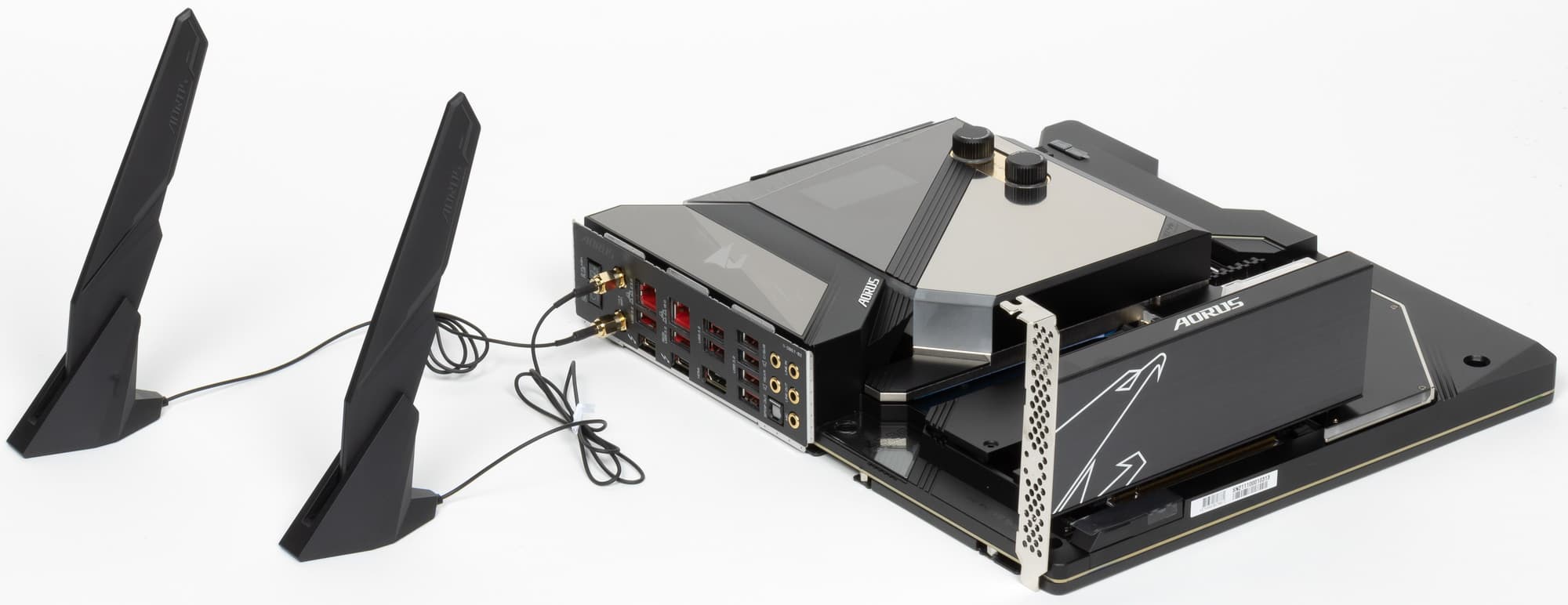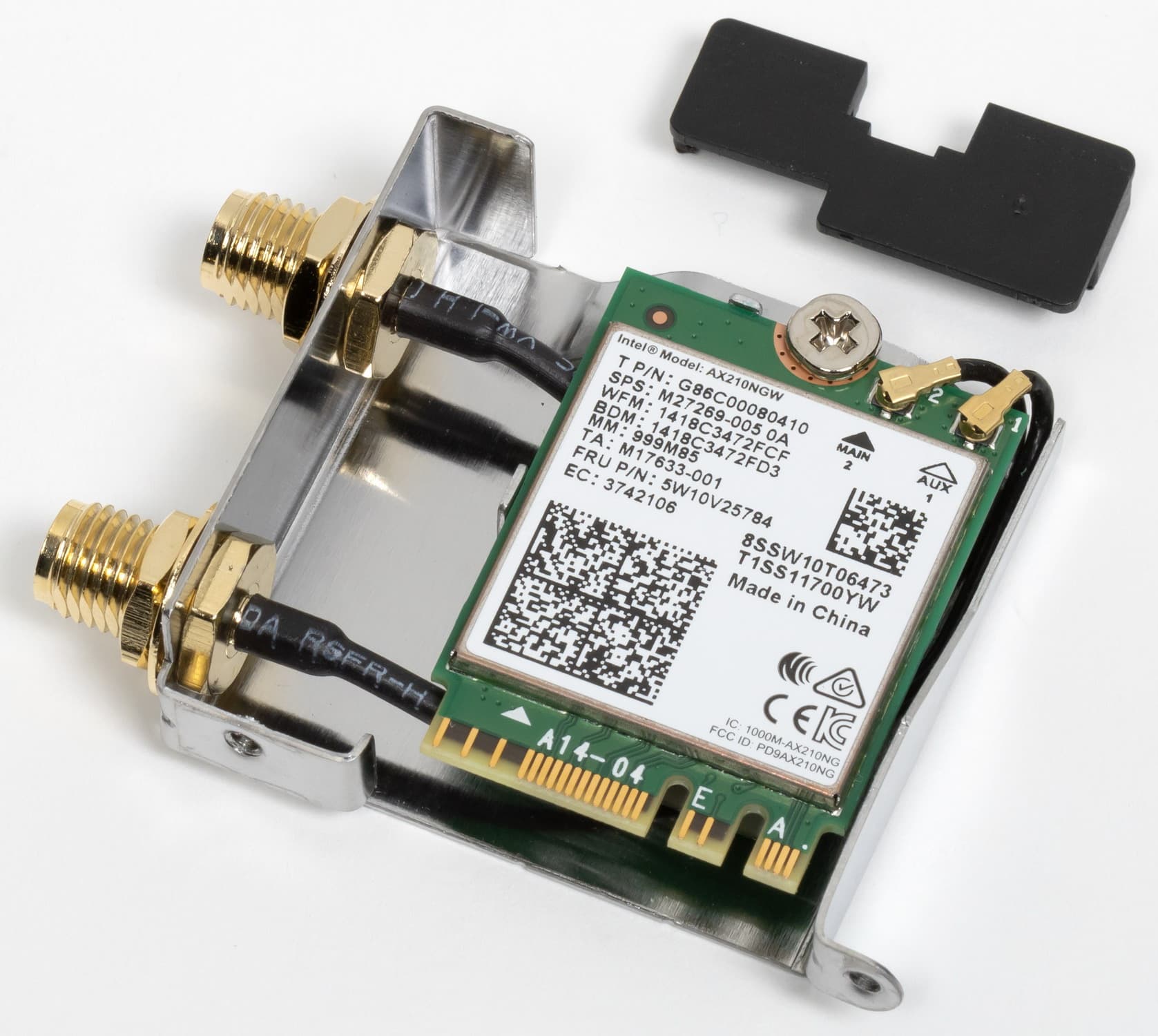 Имеется и комплексный беспроводной адаптер на контроллере Intel AX-210NGW, через который реализованы Wi-Fi 6E (802.11a/b/g/n/ac/ax) и Bluetooth 5.2. Он установлен в слот M.2 (E-key), и его разъемы для привинчивания выносных антенн выведены на заднюю панель. Антенна уникальна тем, что имеет магнитное основание и в случае корпуса с металлическим верхом надежно крепится на нем.