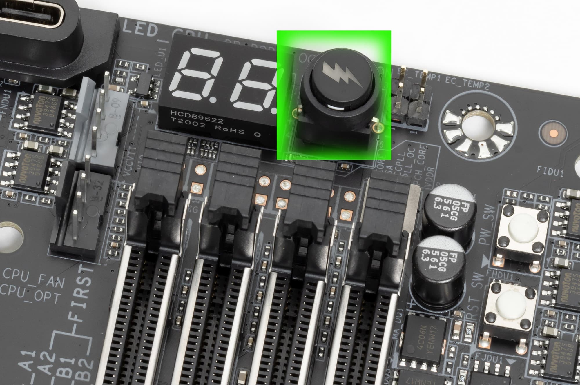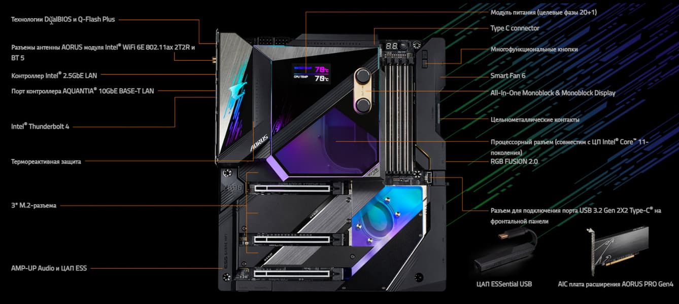 Отличную функциональность! Мы имеем 17 портов USB разных видов (включая 10 очень быстрых USB 3.2 Gen2 и 1 самый быстрый на сегодня USB 3.2 Gen2×2), 3 слота PCIe х16 (из которых первые два получают 16 линий PCIe от процессора), 3 слота M.2 (плюс два на карте расширения), 6 портов SATA, 10 коннекторов для вентиляторов плюс еще 8 через Fan Commander. Система питания процессора включает 20 фаз для ядра (хоть и через удвоители) и способна обеспечить работу любых совместимых процессоров (запас колоссальный). Плата имеет огромный водоблок, которым охлаждается всё, включая накопители в слотах M.2. Шикарные сетевые возможности: два очень быстрых проводных контроллера (2,5 Гбит/с + 10 Гбит/с) и один самый современный беспроводной. Также плата имеет скоростной контроллер Thunderbolt4, который позволяет реализовать не только очень быстрые порты USB Type-C, но и вывод изображения на приемники с огромным разрешением. Стоит упомянуть и наличие бонуса в комплекте поставки в виде USB-аудиоустройства с ЦАП для вывода звука на наушники через Type-C.