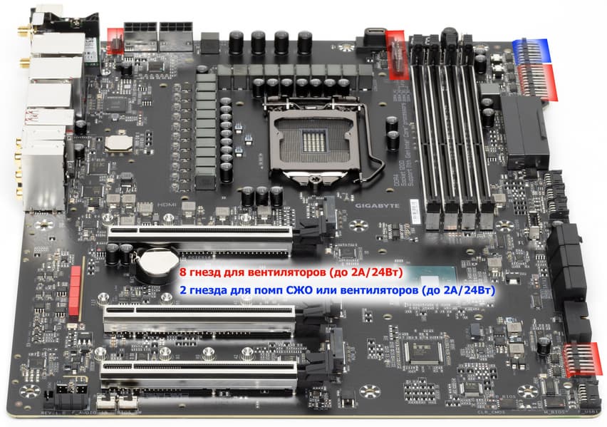 Теперь про блок ввода-вывода, разъемы для подключения вентиляторов и т. п. Разъемов для подключения вентиляторов и помп на самой плате — 10. Схема размещения коннекторов для систем охлаждения выглядит так: