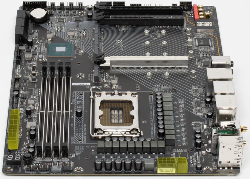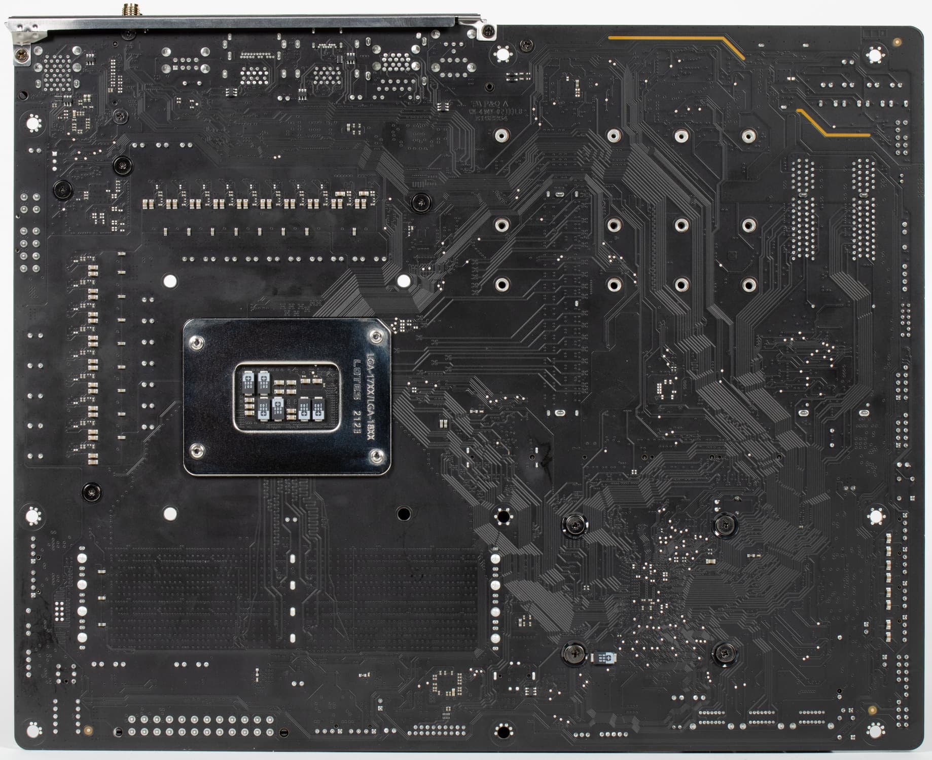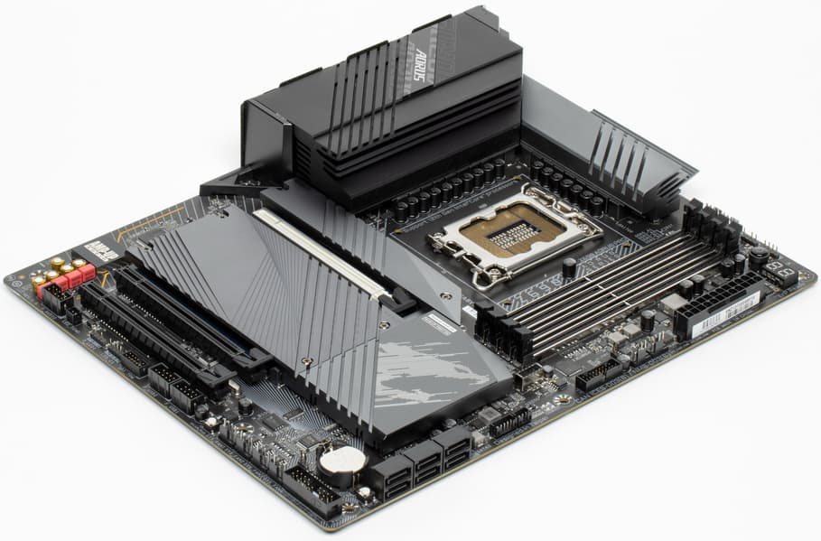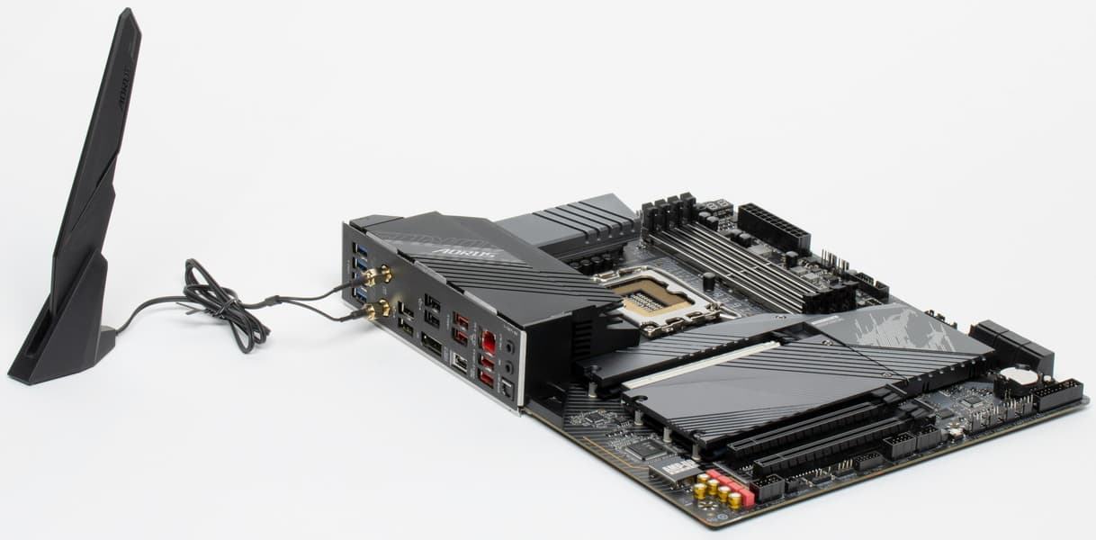 Плата имеет 20 портов USB разных видов (включая два USB 3.2 Gen2×2, 4 USB 3.2 Gen2 и 6 USB 3.2 Gen1), 1 слот PCIe х16 (PCIe 5.0) и 2 слота PCIe x4 для разной периферии, 4(!) слота M.2 и 6 портов SATA. Есть 8 разъемов для подключения вентиляторов и помп, радиаторами оснащены все накопители в слотах M.2. Сетевые подключения — 2,5-гигабитный проводной контроллер и беспроводной с поддержкой Bluetooth и Wi-Fi 6. Подсветка здесь скромная, но имеются широкие возможности для подключения дополнительных RGB-устройств.