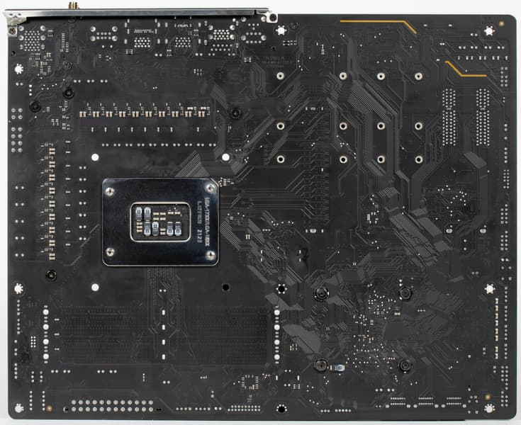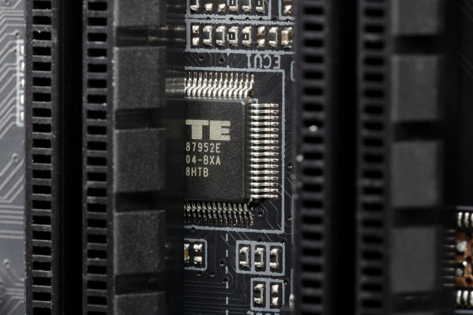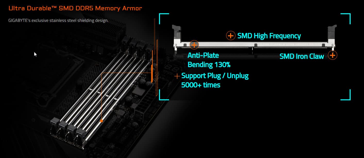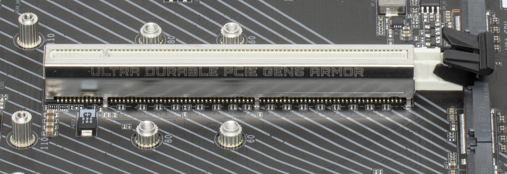 Первый слот PCIe x16_1 имеет металлическое армирование (Ultra Durable PCIe Gen5 armor) из нержавеющей стали, которое увеличивает надежность (что может быть важным в случае довольно частой смены видеокарт, но что более важно: такой слот легче выдержит нагрузку на изгиб в случае установки очень тяжелой видеокарты топового уровня. Кроме того, такая защита предохраняет слоты от электромагнитных помех.