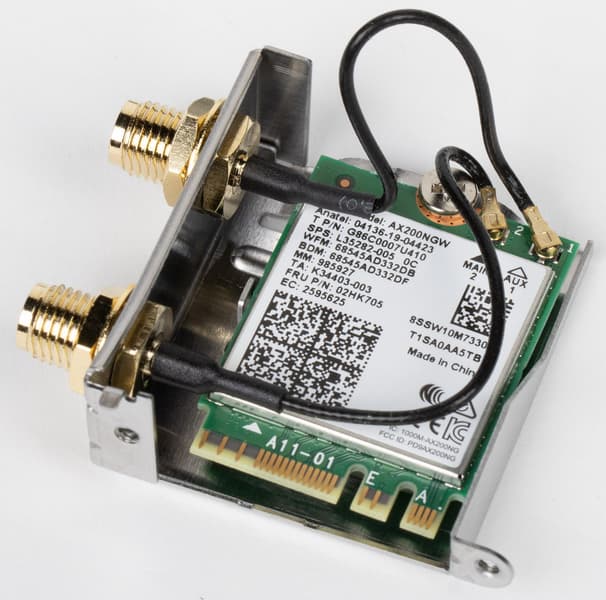 Также есть комплексный беспроводной адаптер на контроллере Intel AX-200NGW, через который реализованы Wi-Fi 6E (802.11a/b/g/n/ac/ax) и Bluetooth 5.2. Он установлен в слот M.2 (E-key), и его разъемы для привинчивания выносных антенн выведены на заднюю панель.