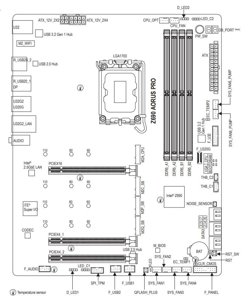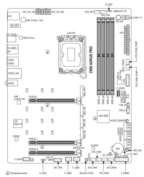 Форм-фактор ATX имеет размеры до 305×244 мм, а E-ATX — до 305×330 мм. Материнская плата Gigabyte Z690 Aorus Pro имеет размеры 305×244 мм, поэтому выполнена в форм-факторе ATX, и на ней имеются 9 монтажных отверстий для установки в корпус. Однако следует иметь в виду, что одно из девяти монтажных отверстий перекрыто радиатором для слота M.2.