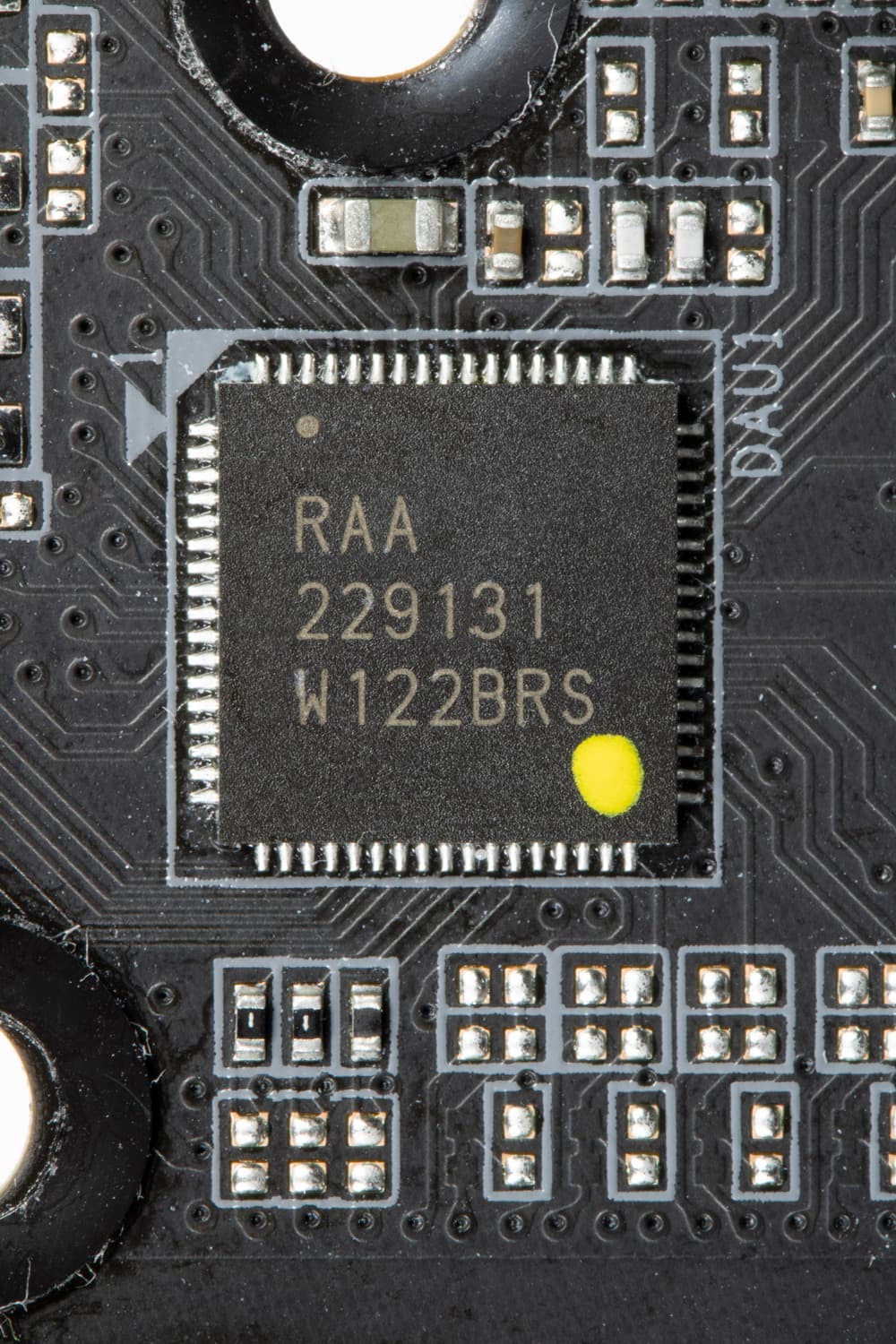 Ни ЦАП, ни операционных усилителей в данном тракте не предусмотрено. В аудиоцепях платы применяются «аудиофильские» конденсаторы Nippon Chemi-con. Аудиотракт вынесен на угловую часть платы, не пересекается с другими элементами. Разумеется, левый и правый каналы разведены по разным слоям печатной платы. Маркировок у гнезд нет.